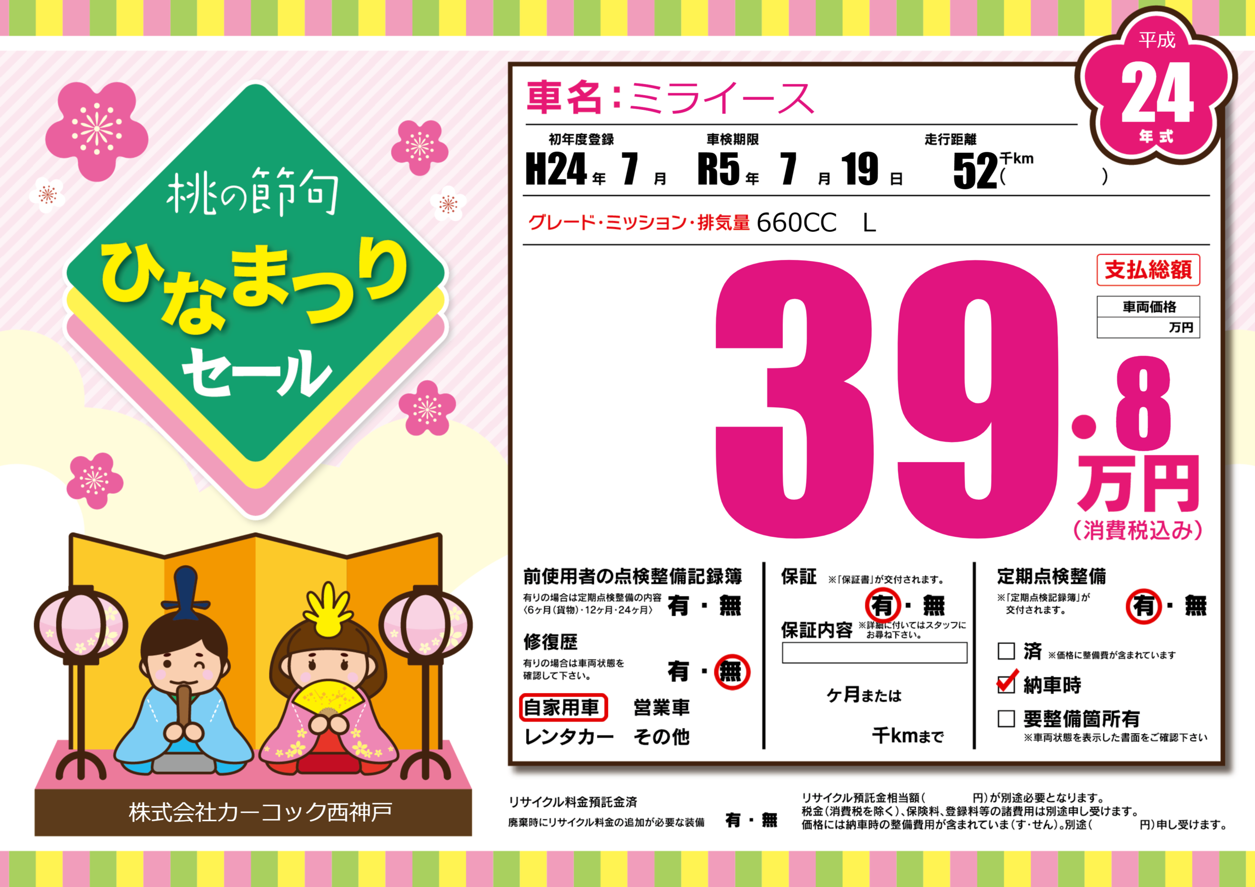| 定期点検整備 | 定期点検整備あり 納車時あり | ||
