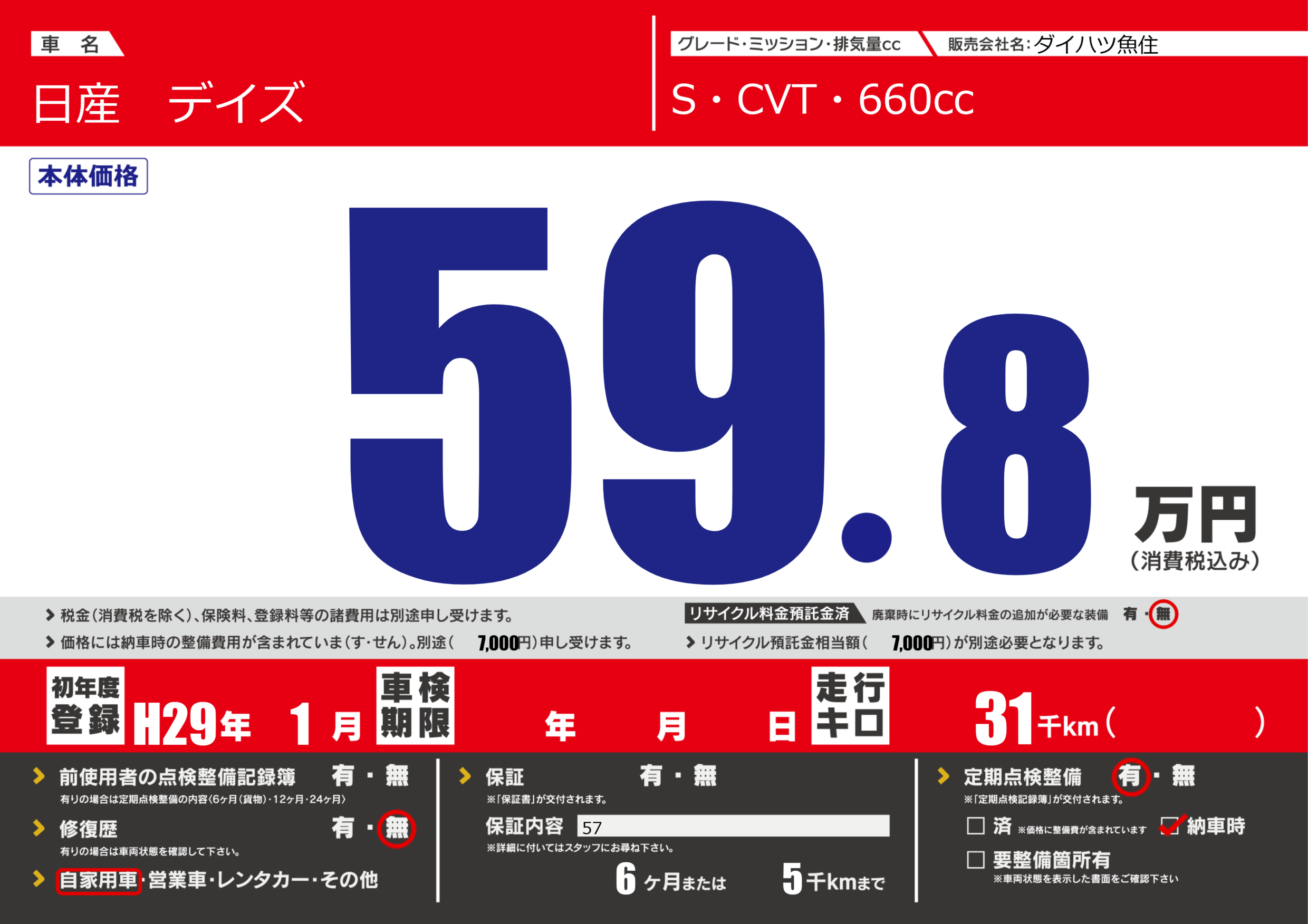 | 車名 | 日産 デイズ | グレード ミッション 排気量 |