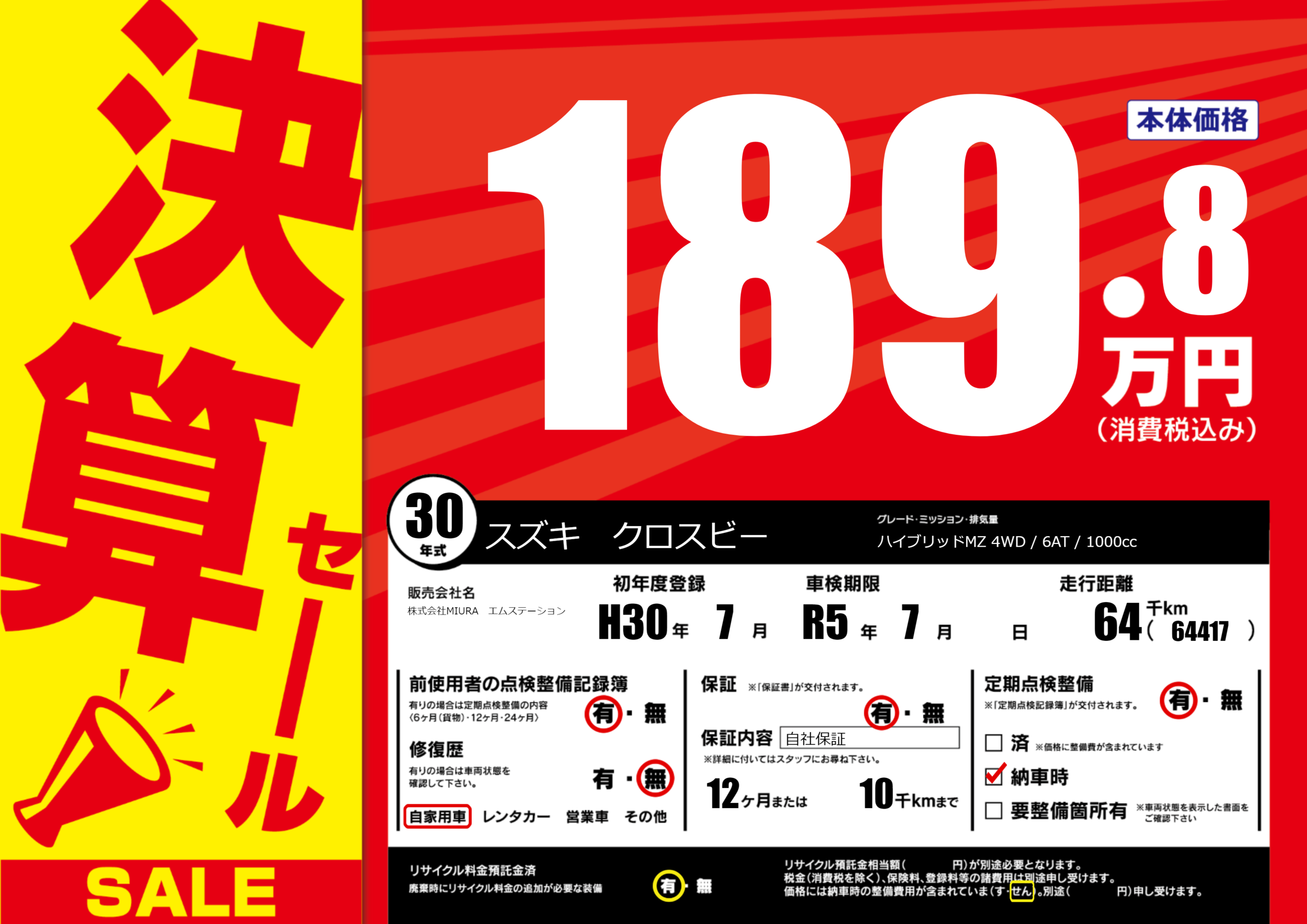 | 定期点検整備 | 定期点検整備あり 納車時あり | ||