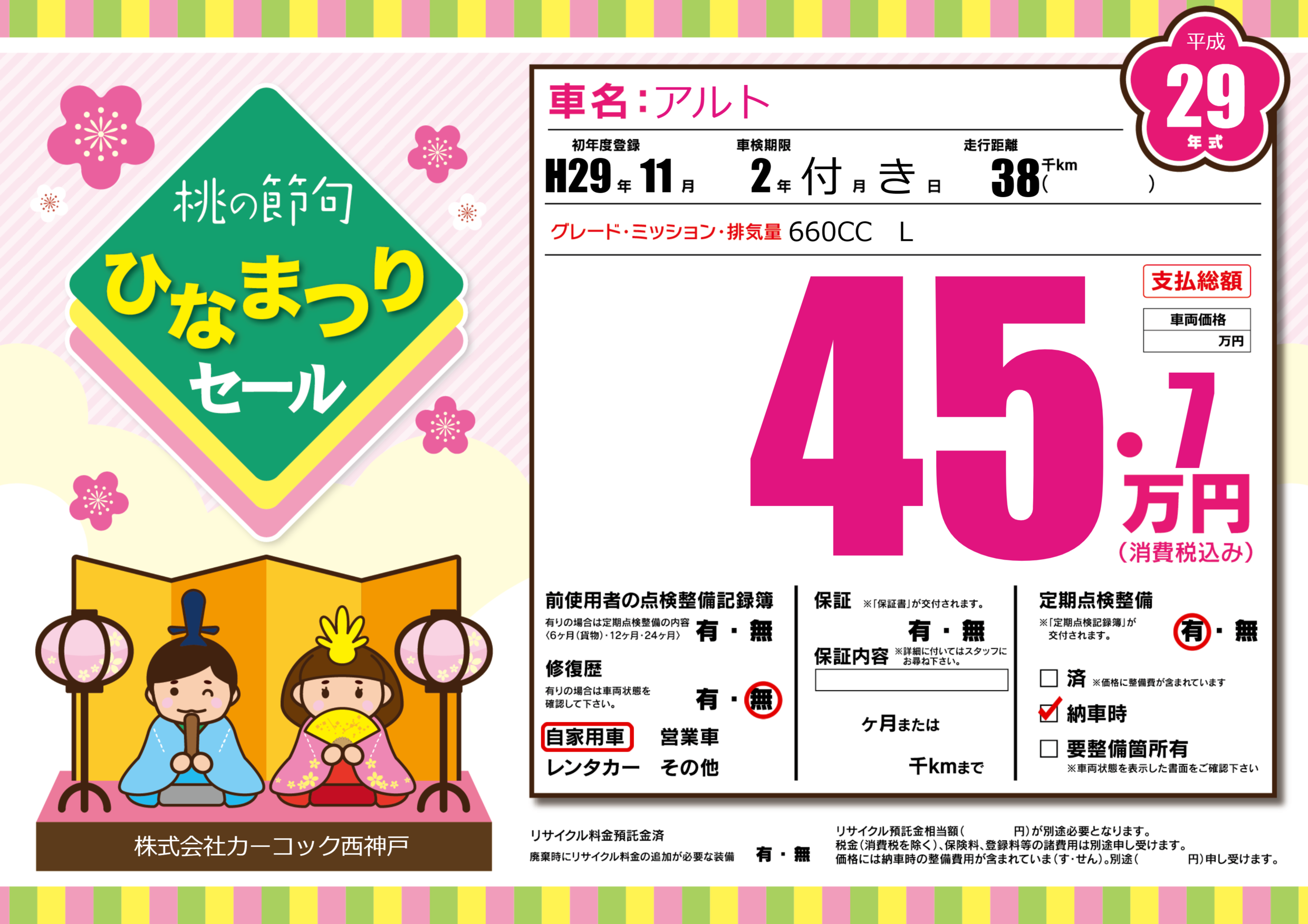 | 定期点検整備 | 定期点検整備あり 納車時あり | ||