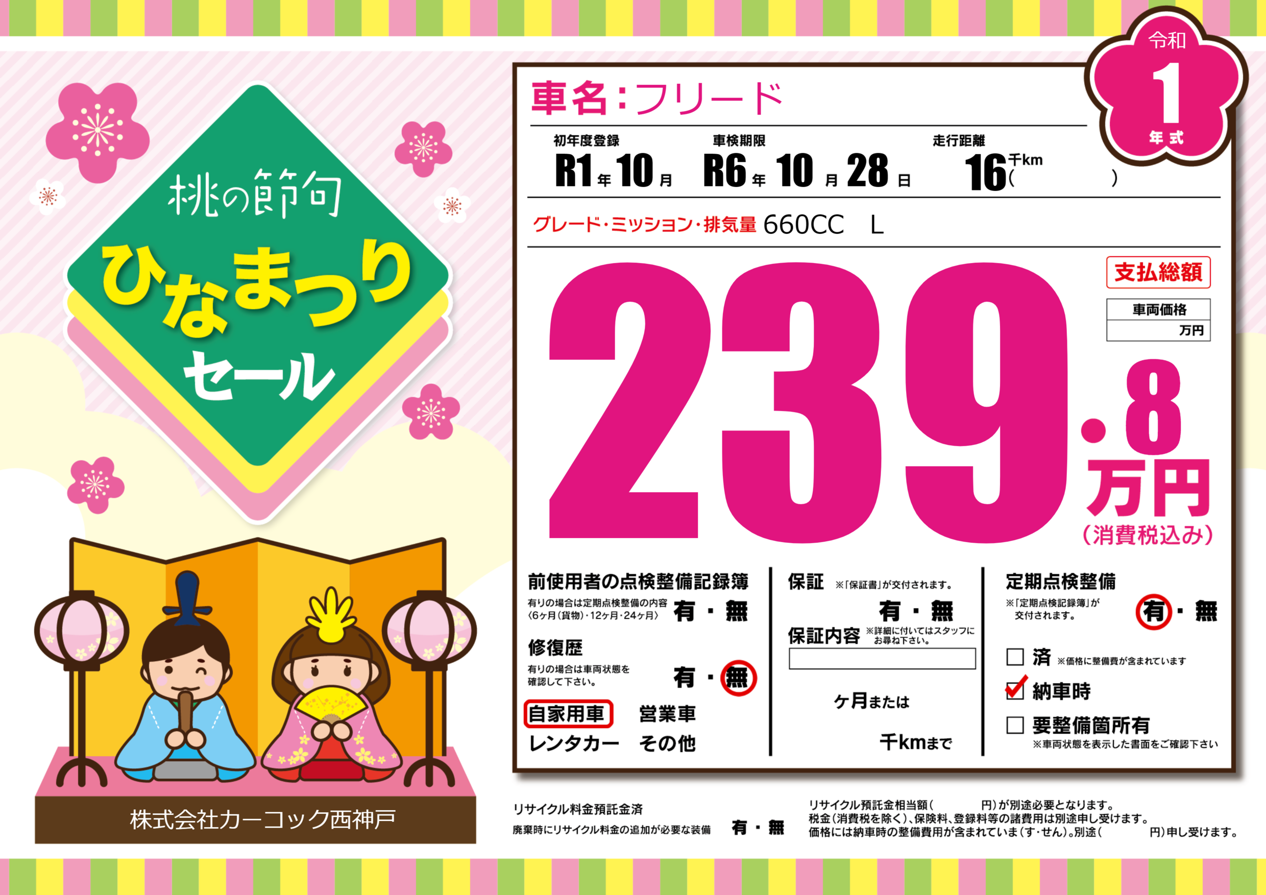 | 定期点検整備 | 定期点検整備あり 納車時あり | ||