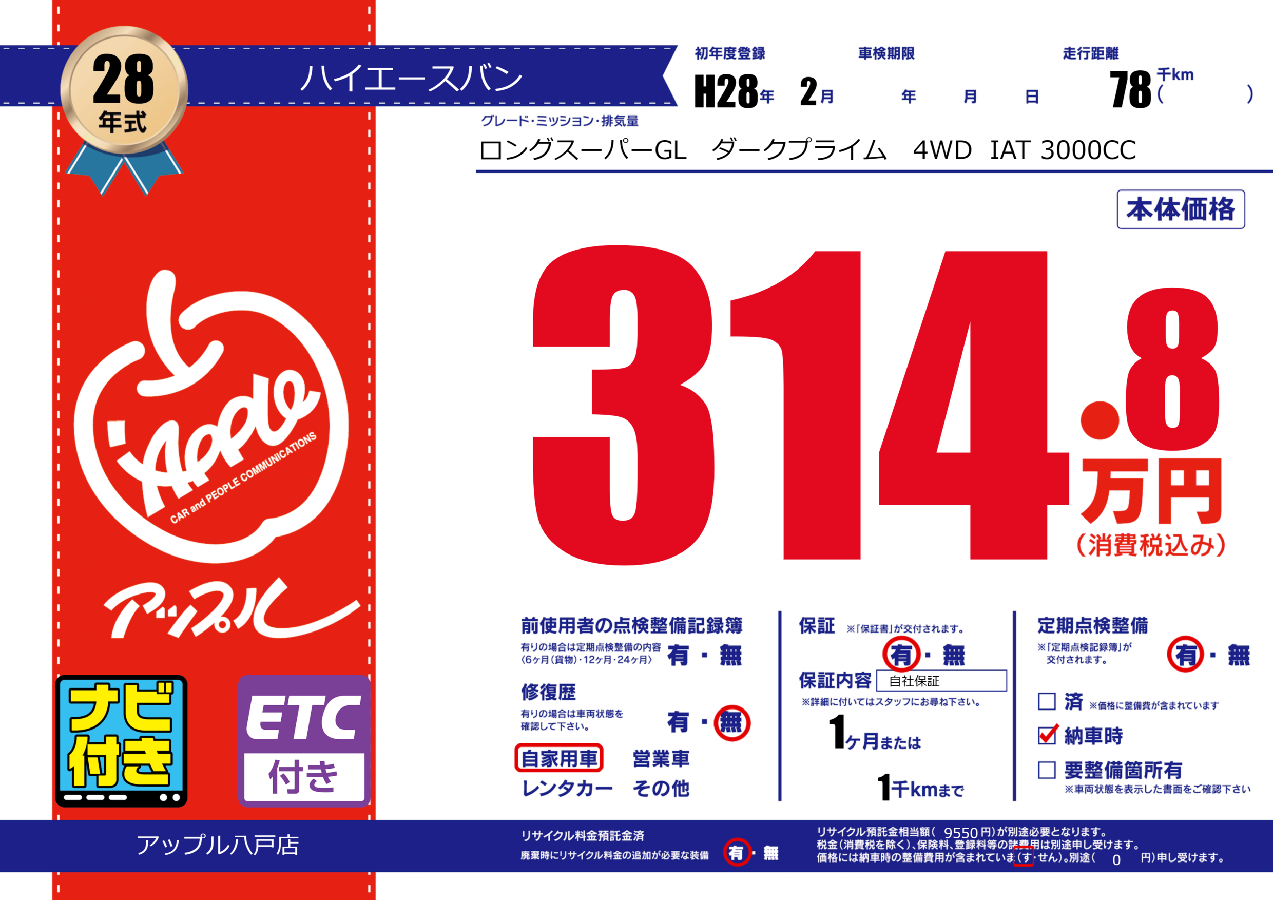 | 走行キロ | 7.8万km | 初年度登録 | H28年2月 |