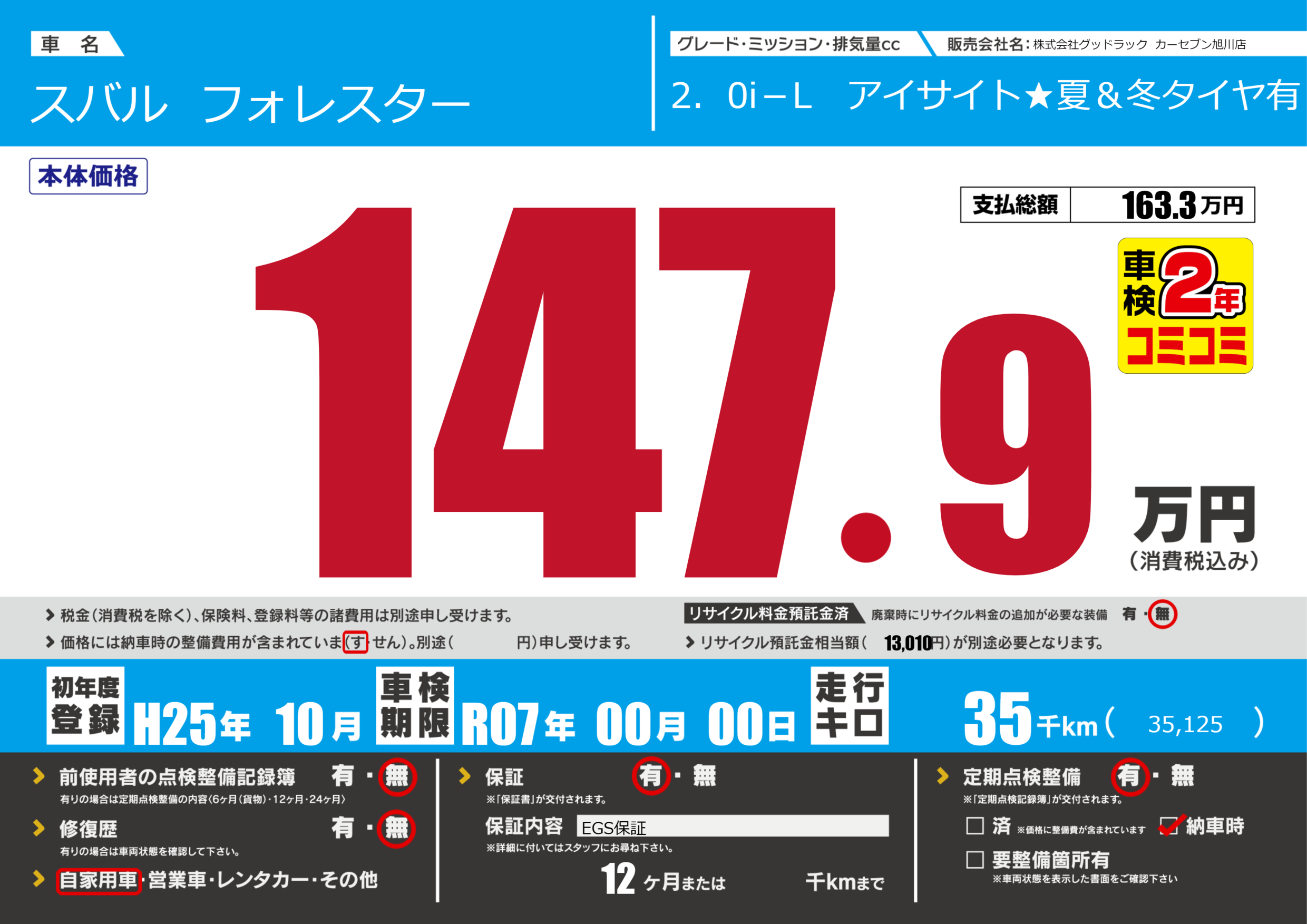 | 車検制限 | R07年 00月 00日 | ||