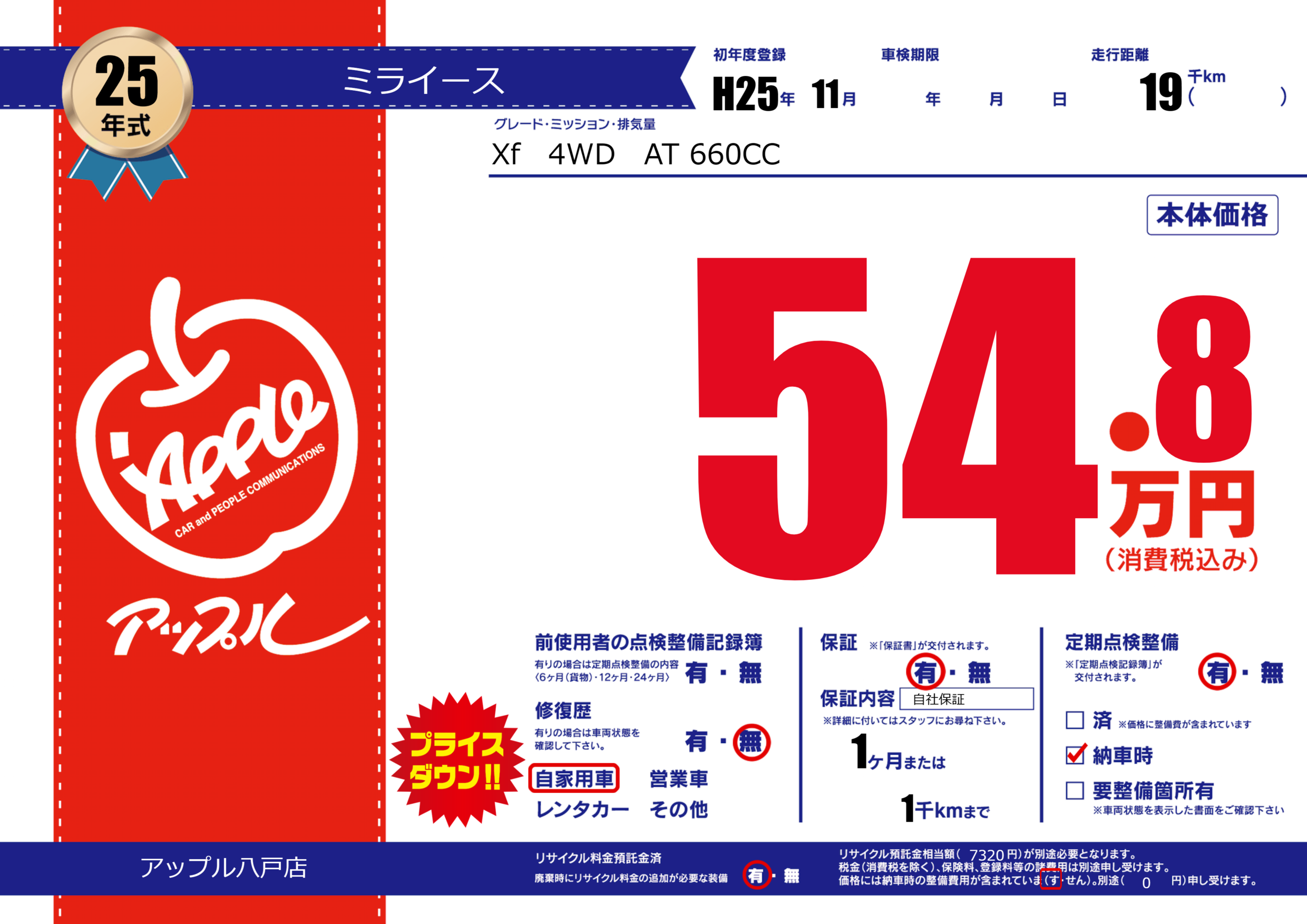 保証付き 保証内容( 自社保証) 1ヶ月または(1)千kmまで |