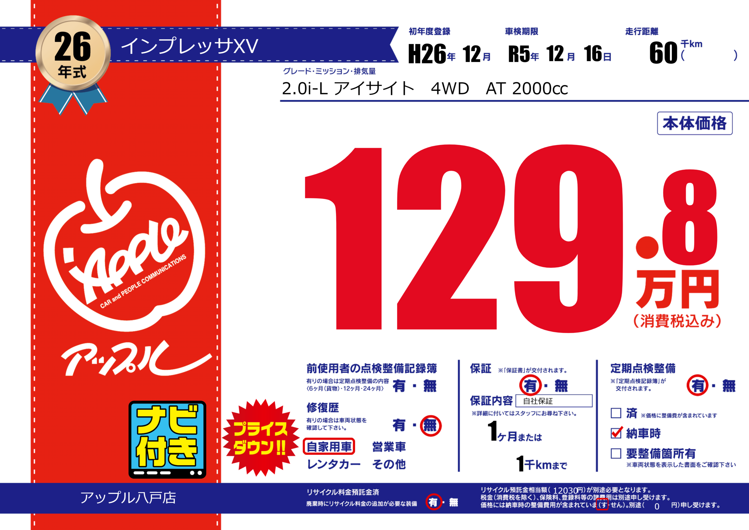 | 車名 | インプレッサXV | グレード ミッション 排気量 |
