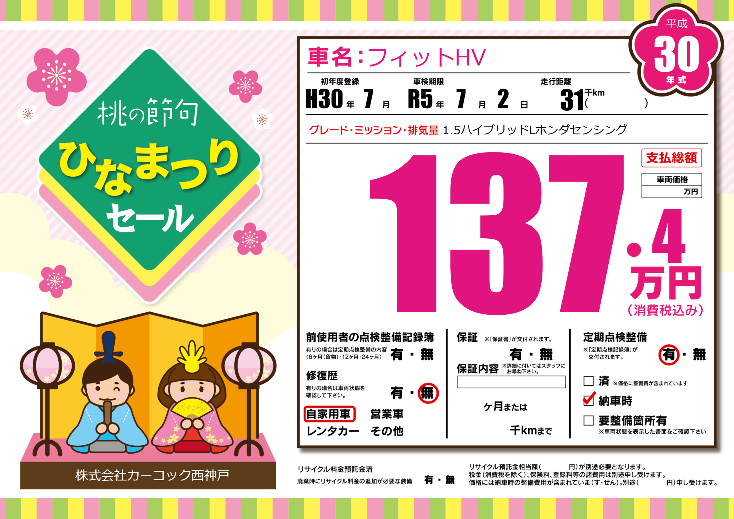 | 定期点検整備 | 定期点検整備あり 納車時あり | ||