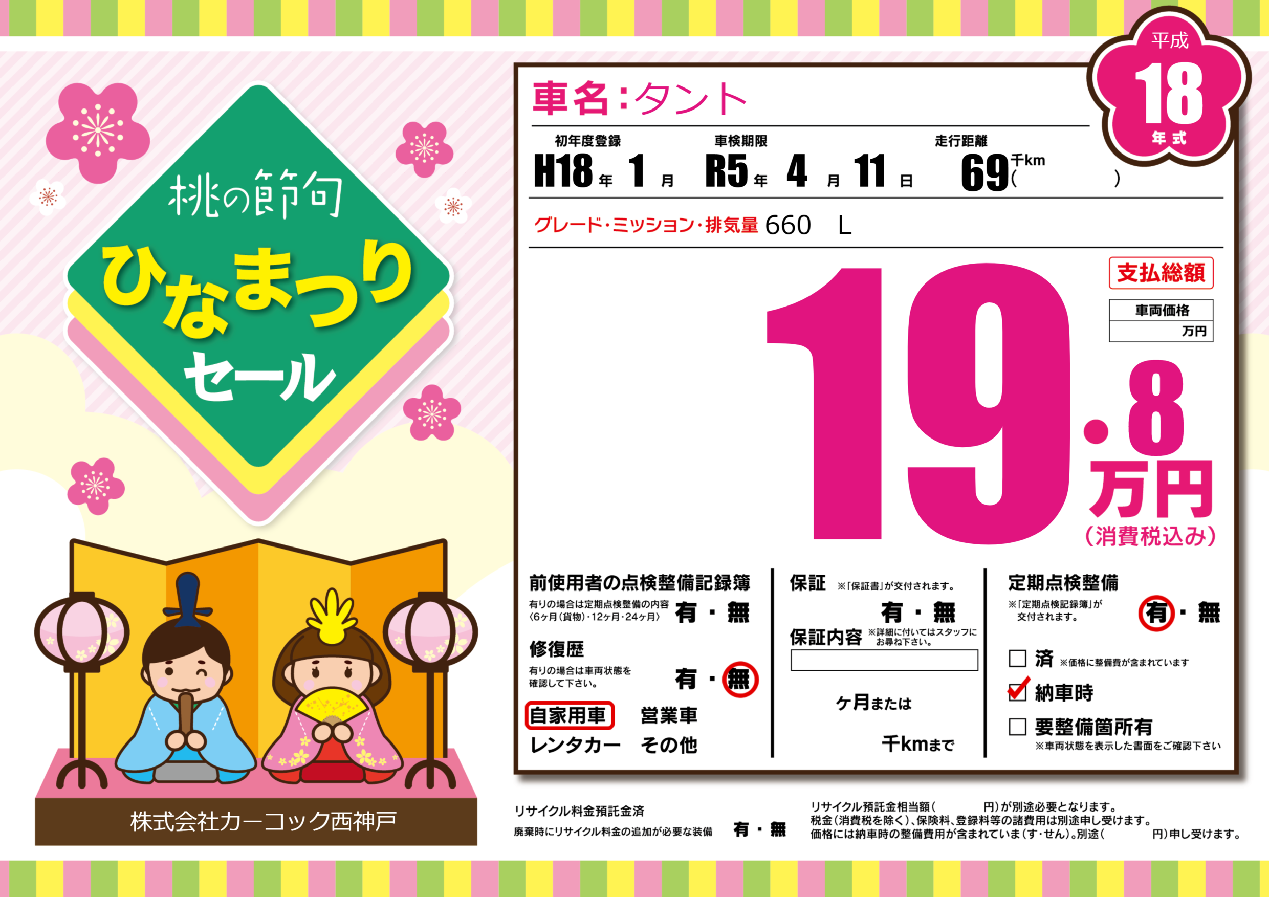 | 定期点検整備 | 定期点検整備あり 納車時あり | ||