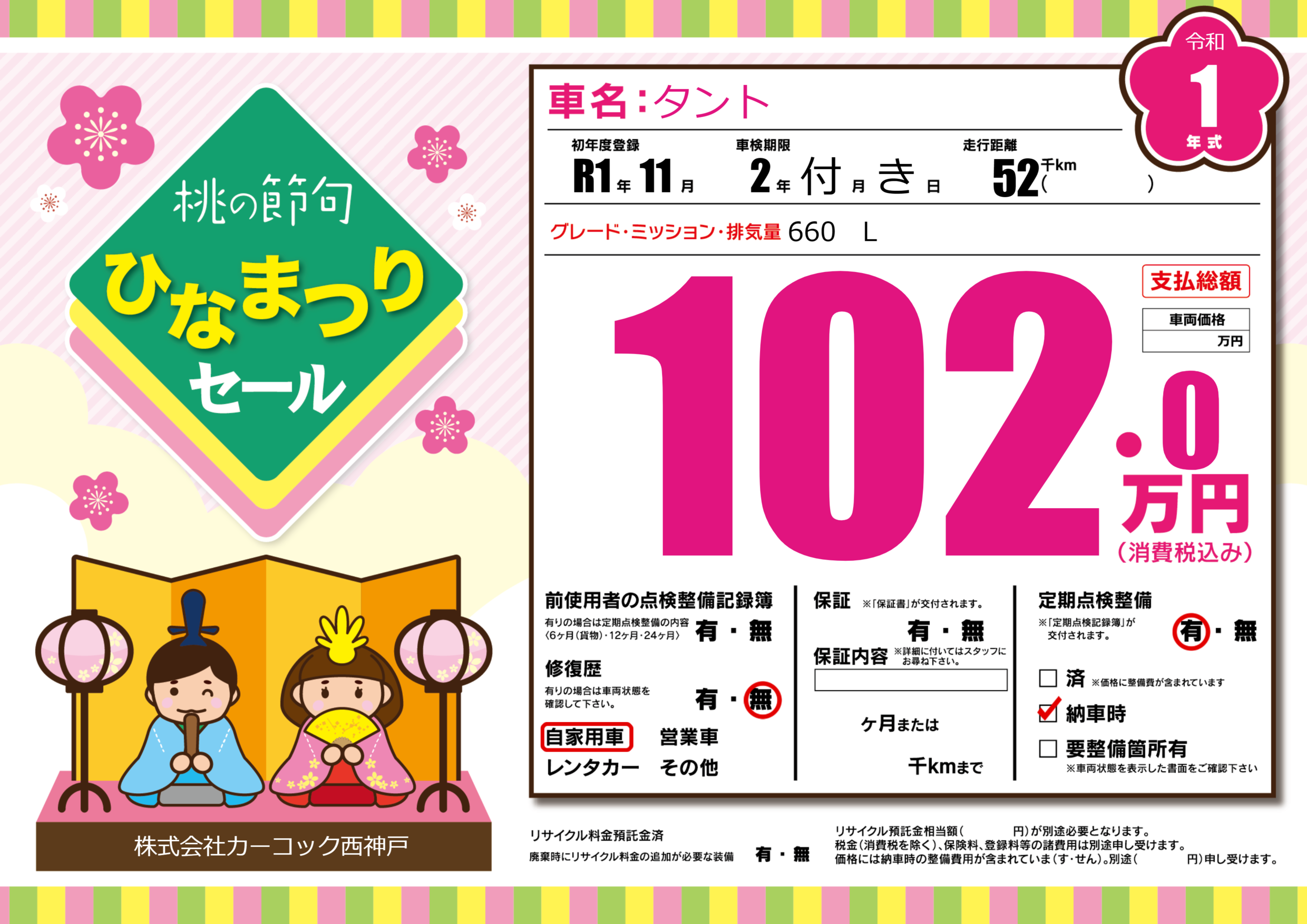 | 定期点検整備 | 定期点検整備あり 納車時あり | ||