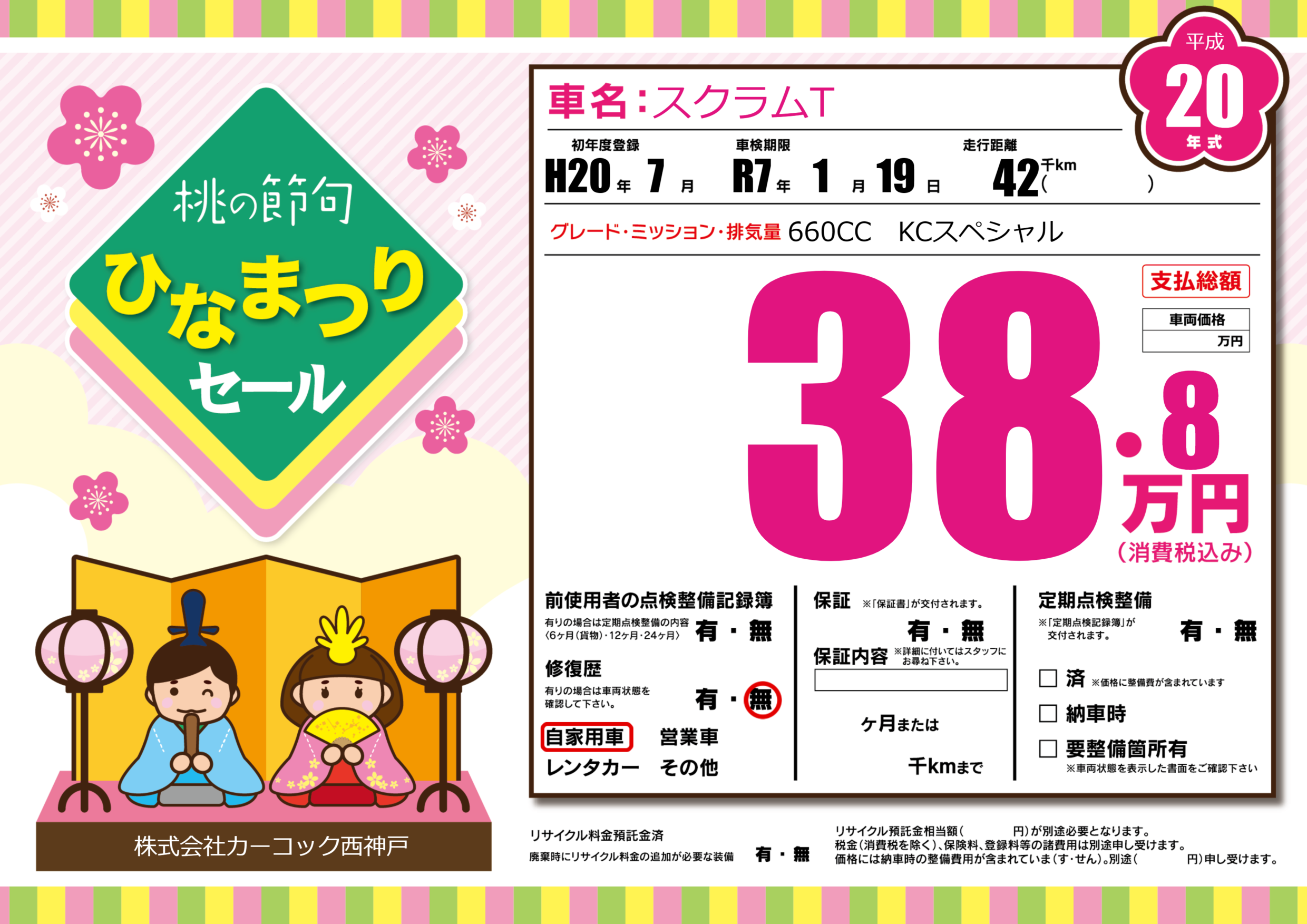 | 走行キロ | 4.2万km | 初年度登録 | H20年7月 |