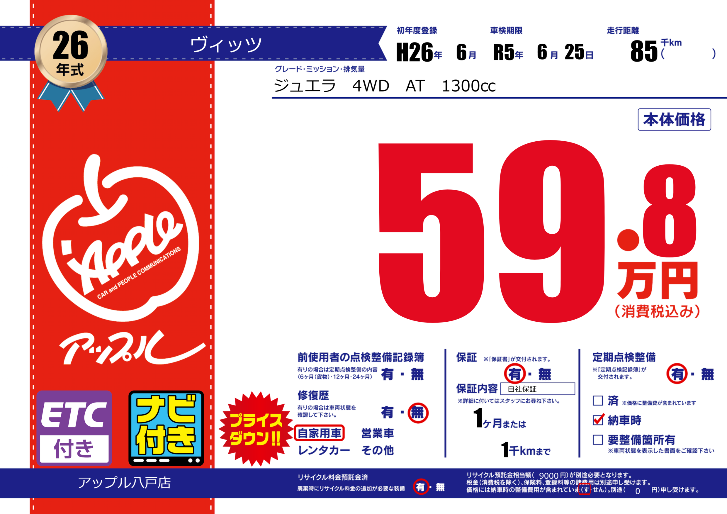 | 走行キロ | 8.5万km | 初年度登録 | H26年6月 |