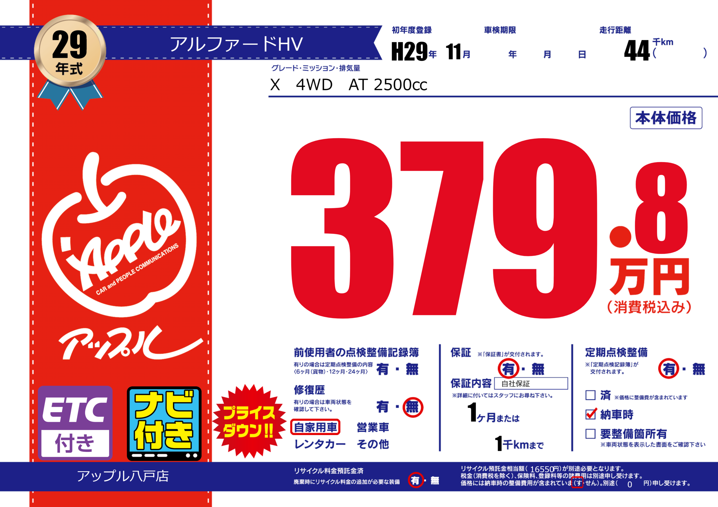 保証付き 保証内容( 自社保証) 1ヶ月または(1)千kmまで |