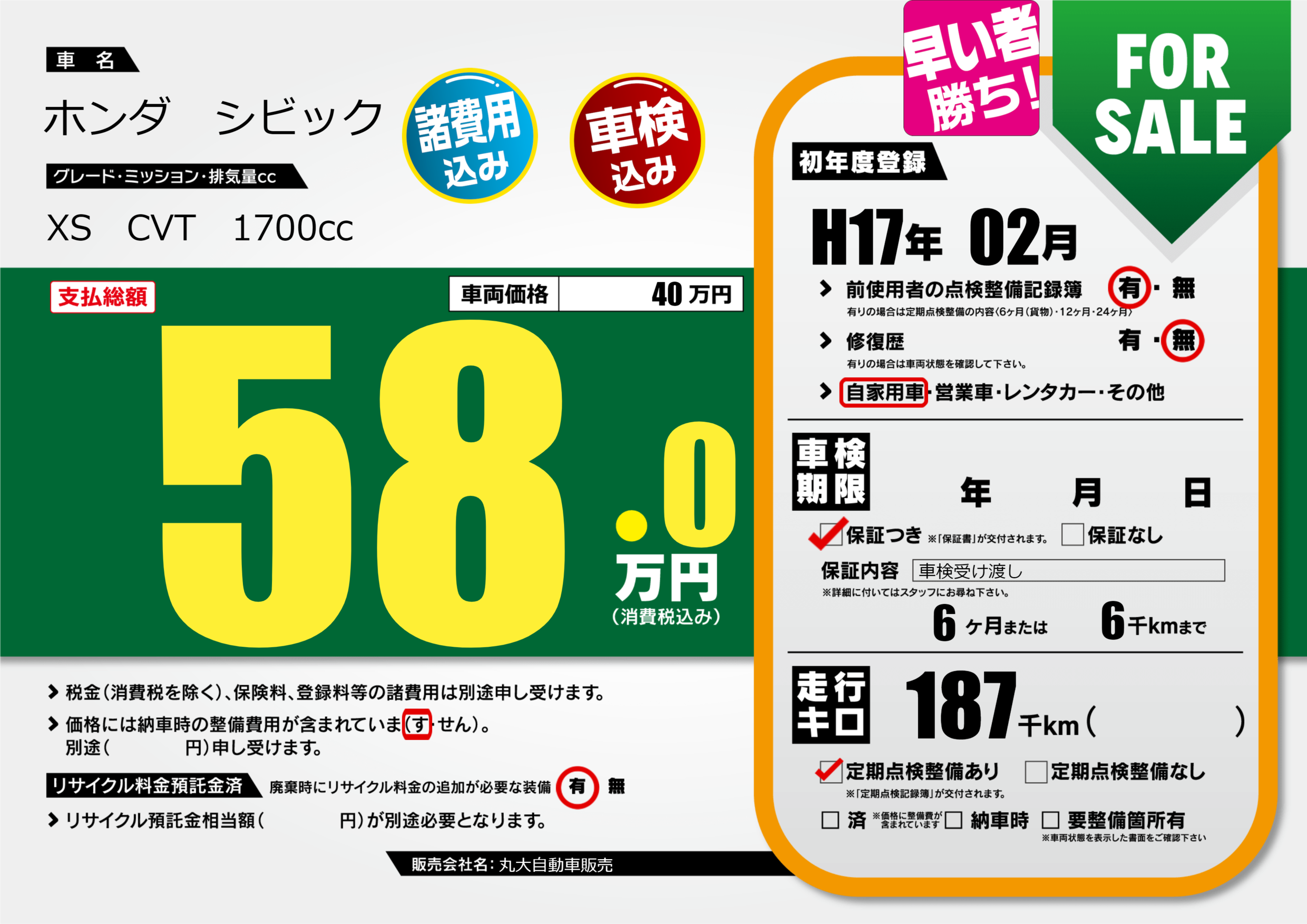 | 車名 | ホンダ シビック | グレード ミッション 排気量 |