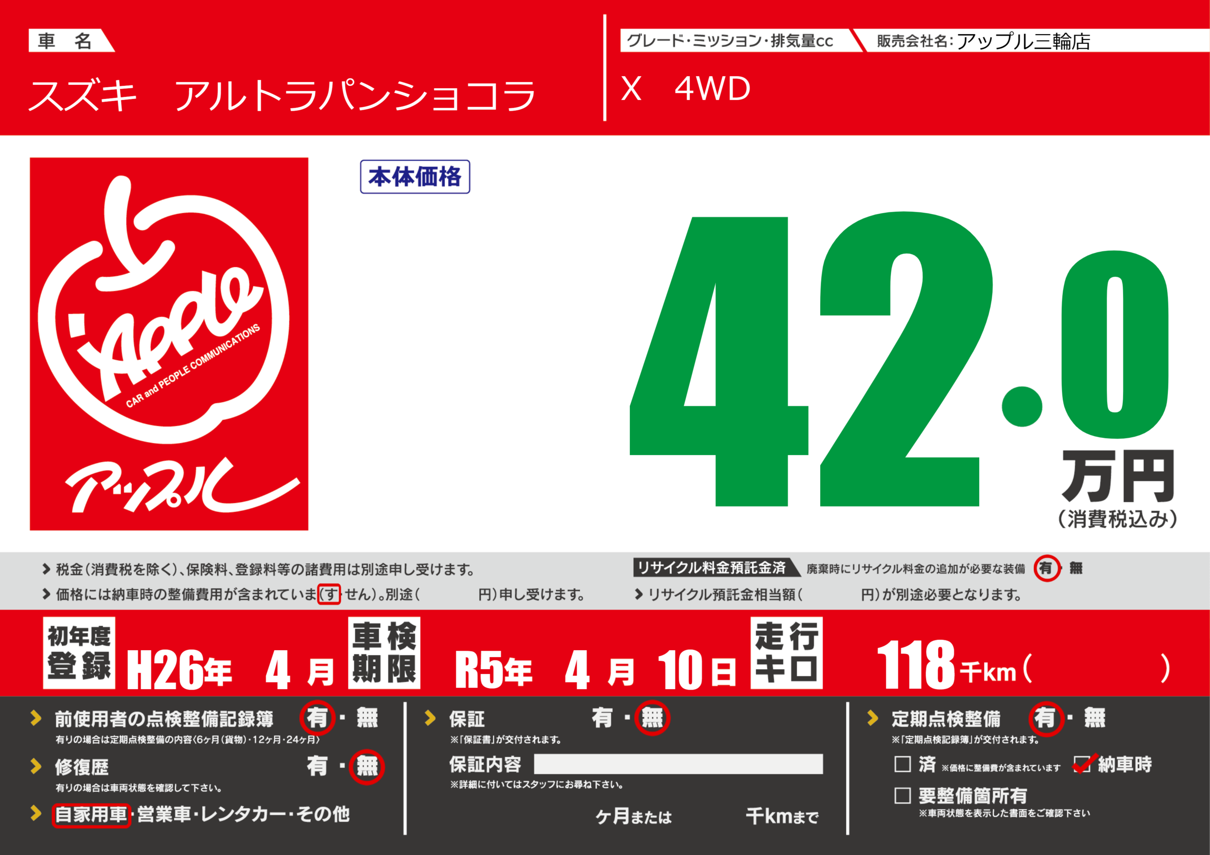 | 定期点検整備 | 定期点検整備あり 納車時あり | ||