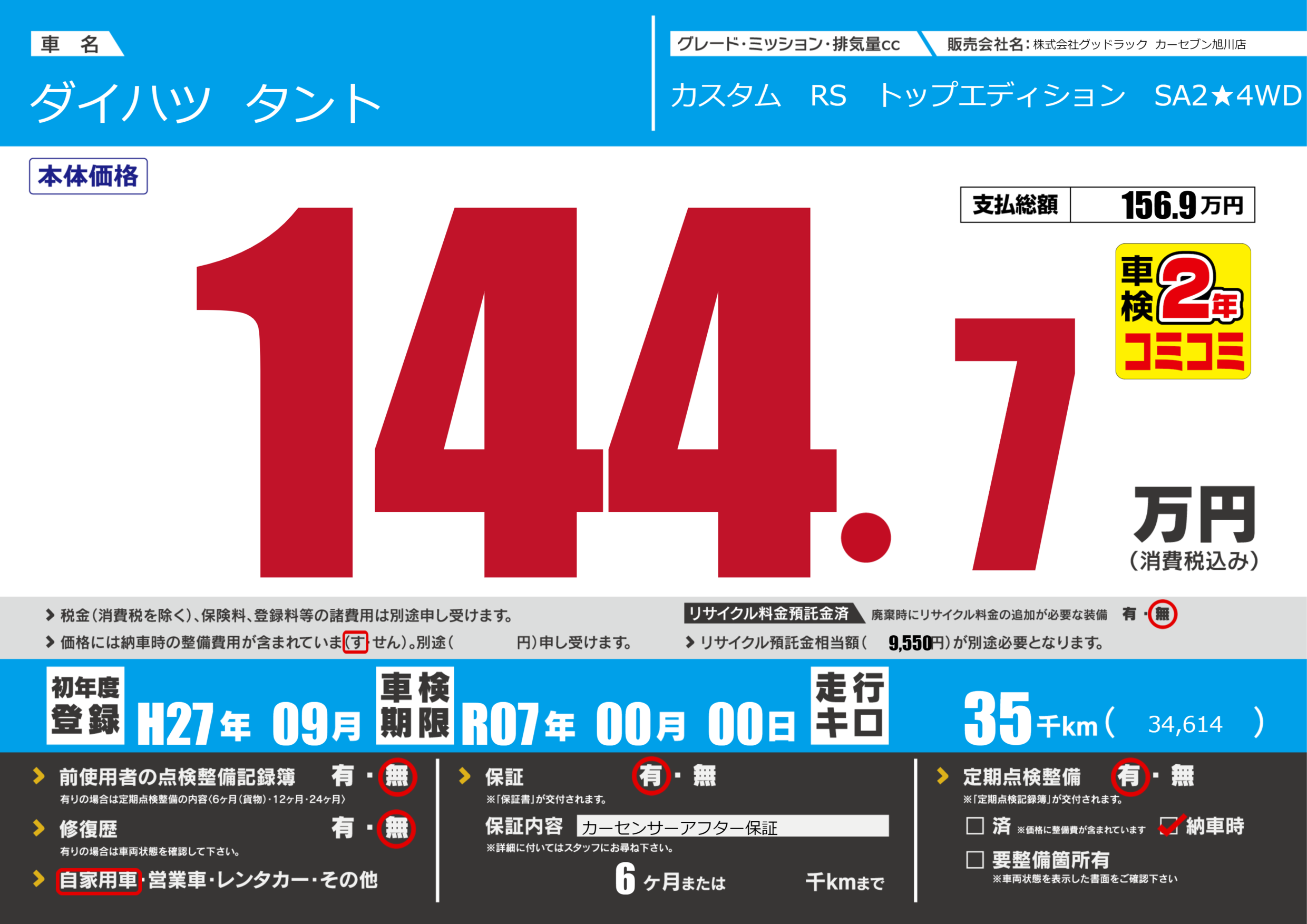 | 車名 | ダイハツ タント | グレード ミッション 排気量 |