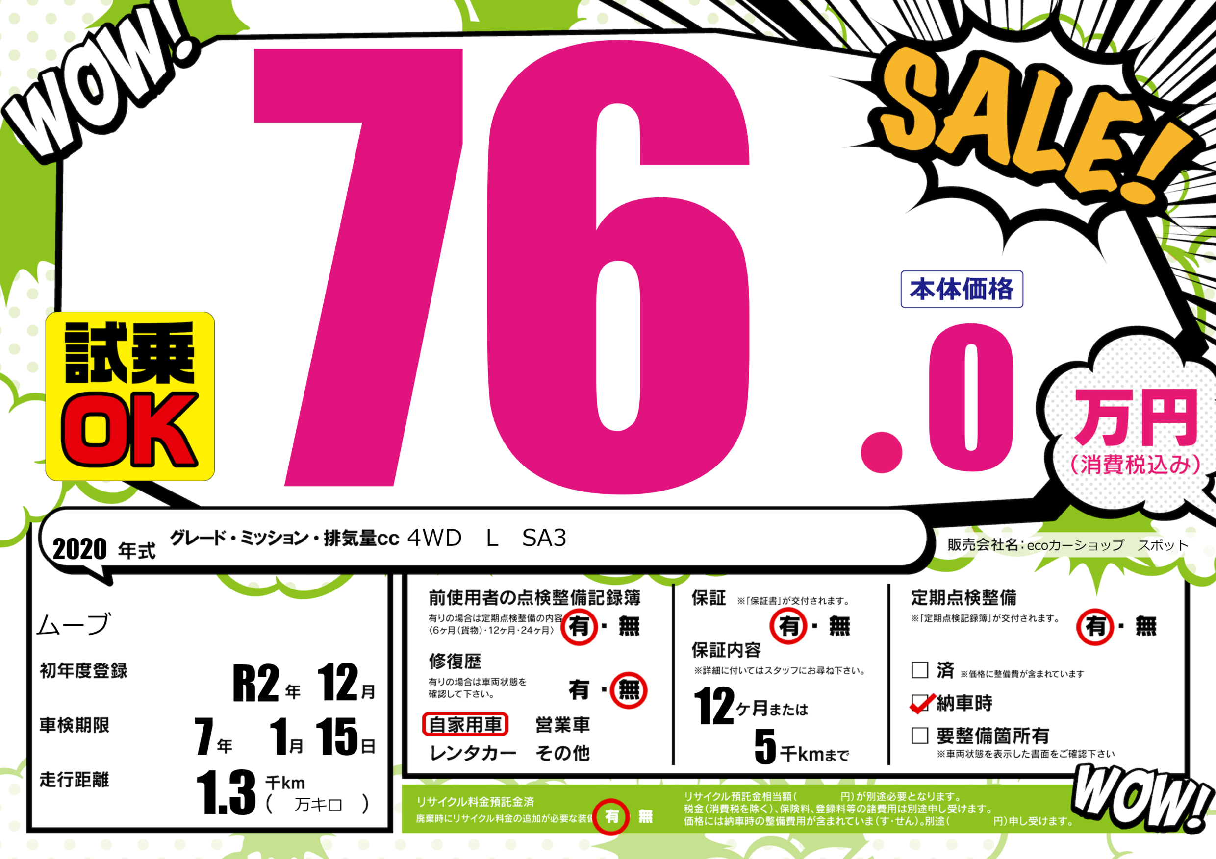 | 走行キロ | 0.1万km | 初年度登録 | R2年12月 |