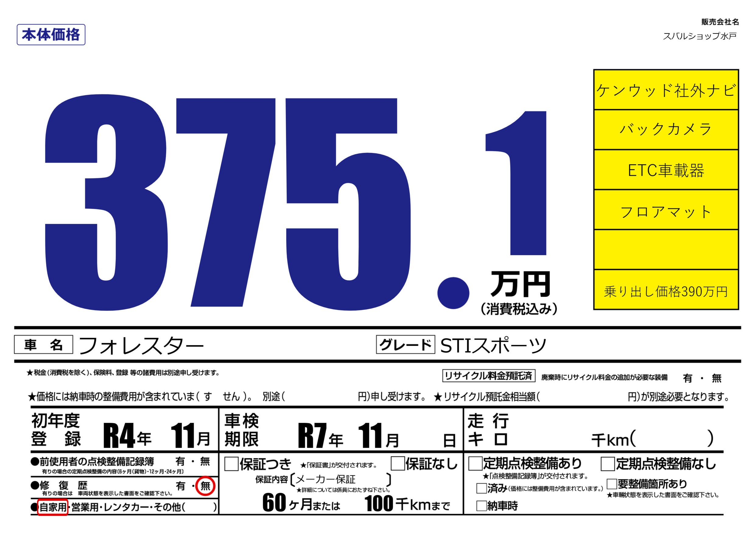 | 車検制限 | R7年 11月 - 日 | ||