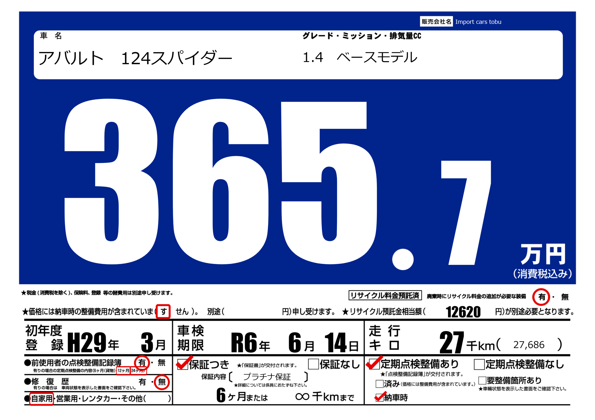 | 車名 | アバルト 124スパイダー | グレード ミッション 排気量 |