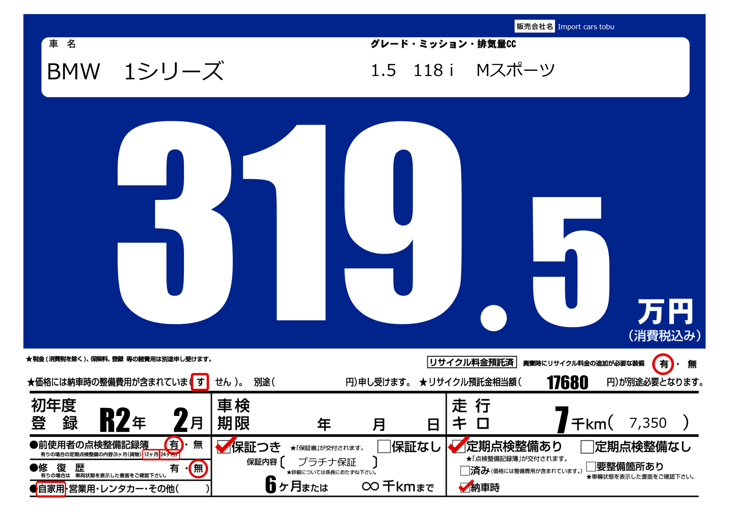 保証付き 保証内容( プラチナ保証) 6ヶ月または(∞)千kmまで |
