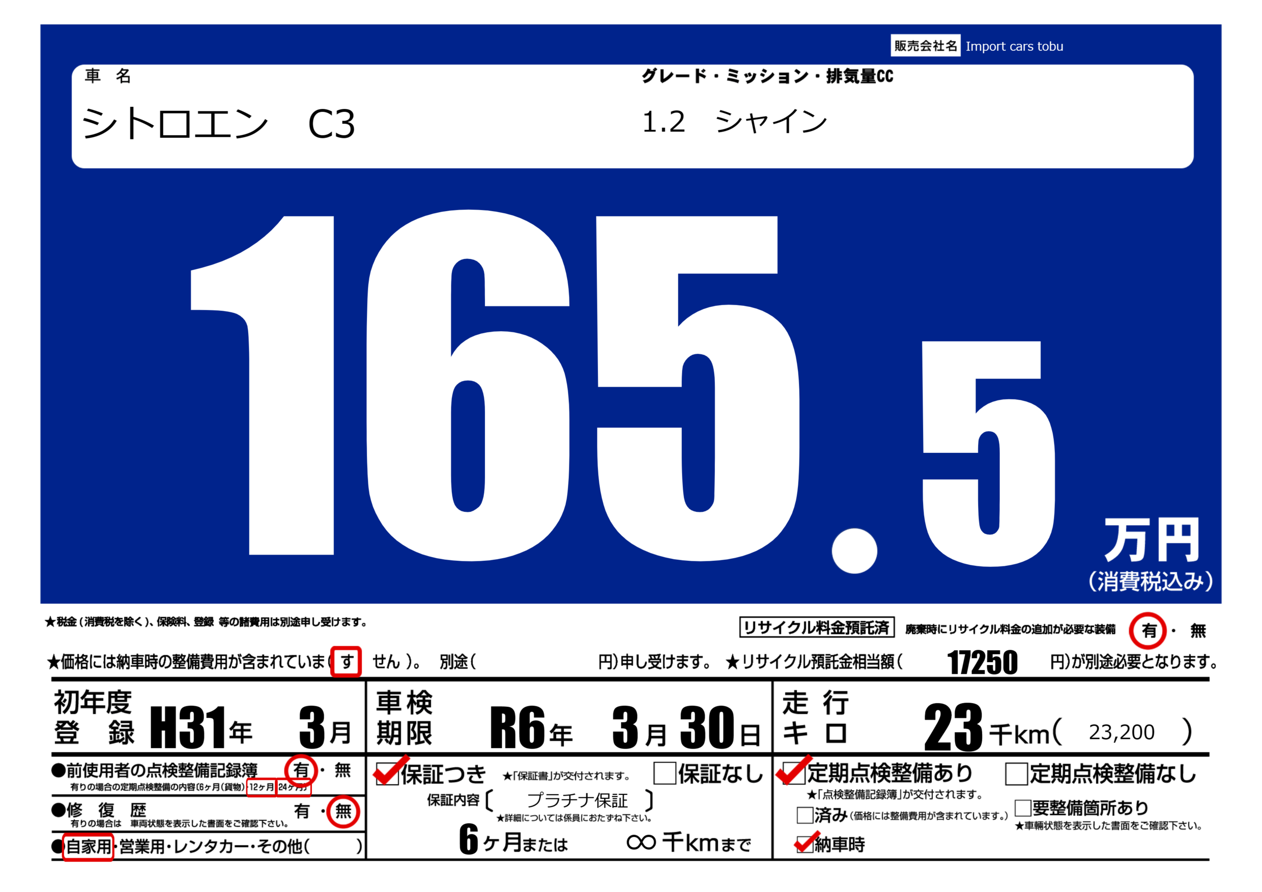 | 車名 | シトロエン C3 | グレード ミッション 排気量 |