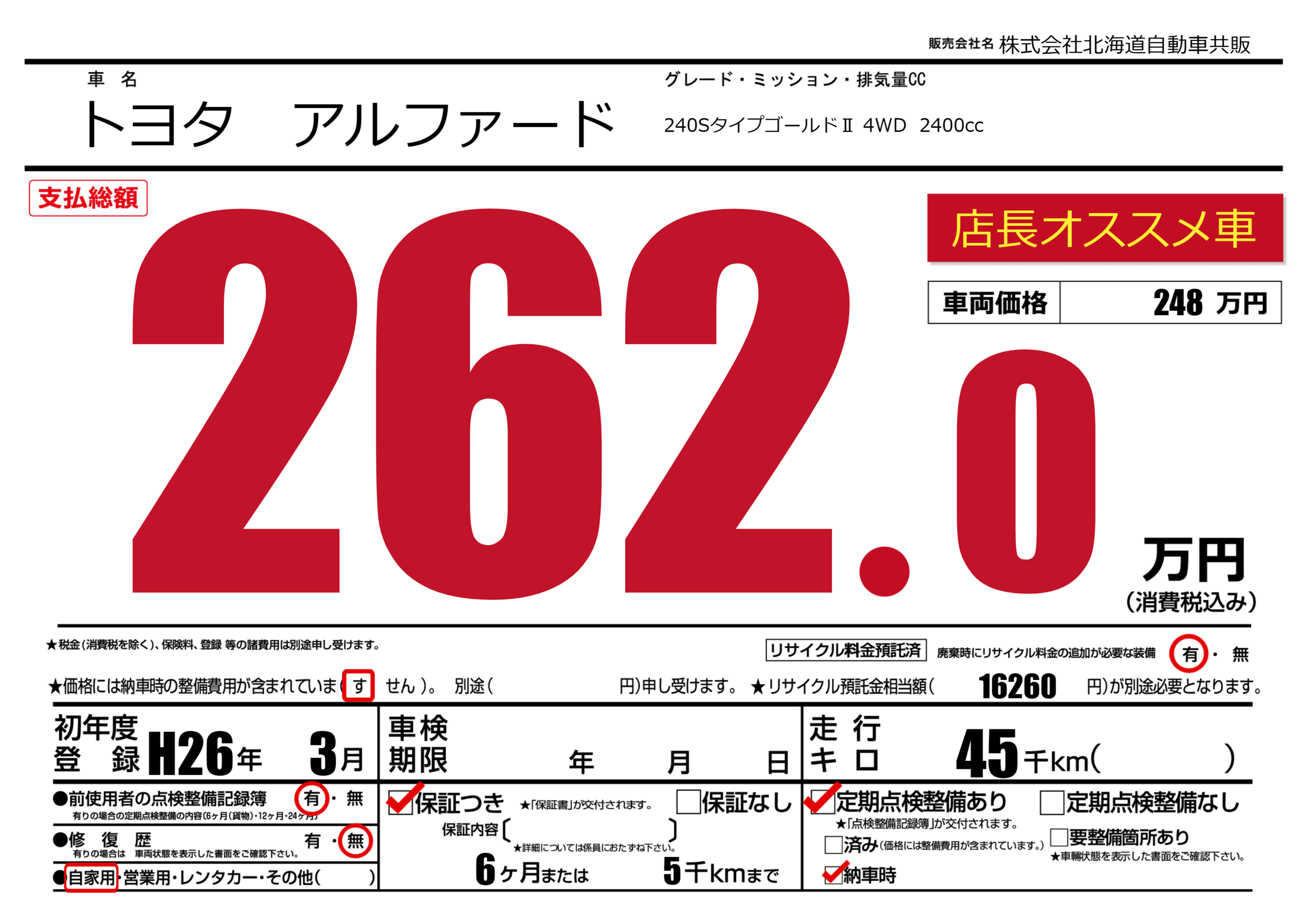 | 車名 | トヨタ アルファード | グレード ミッション 排気量 |