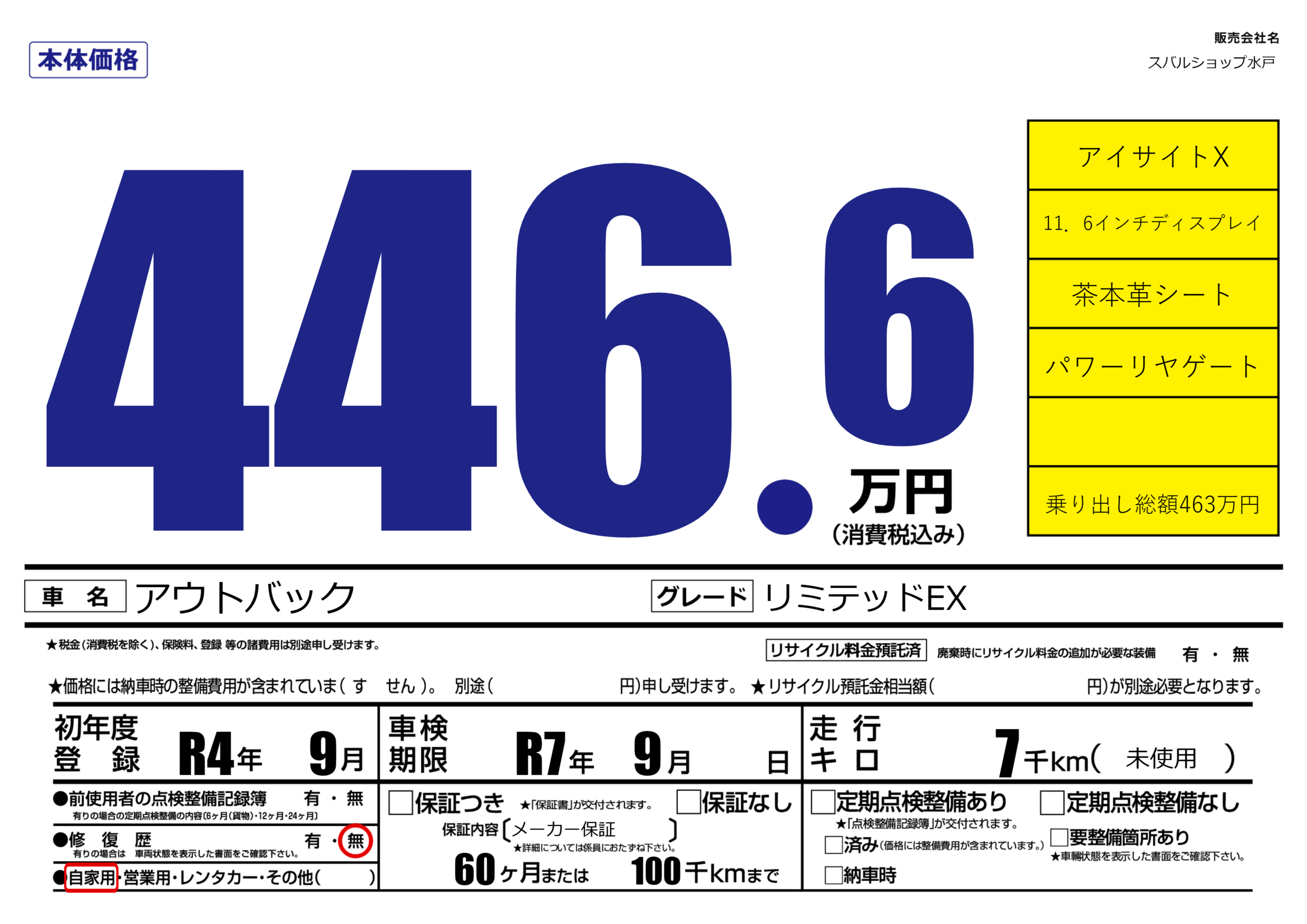 | 車名 | アウトバック | グレード ミッション 排気量 |