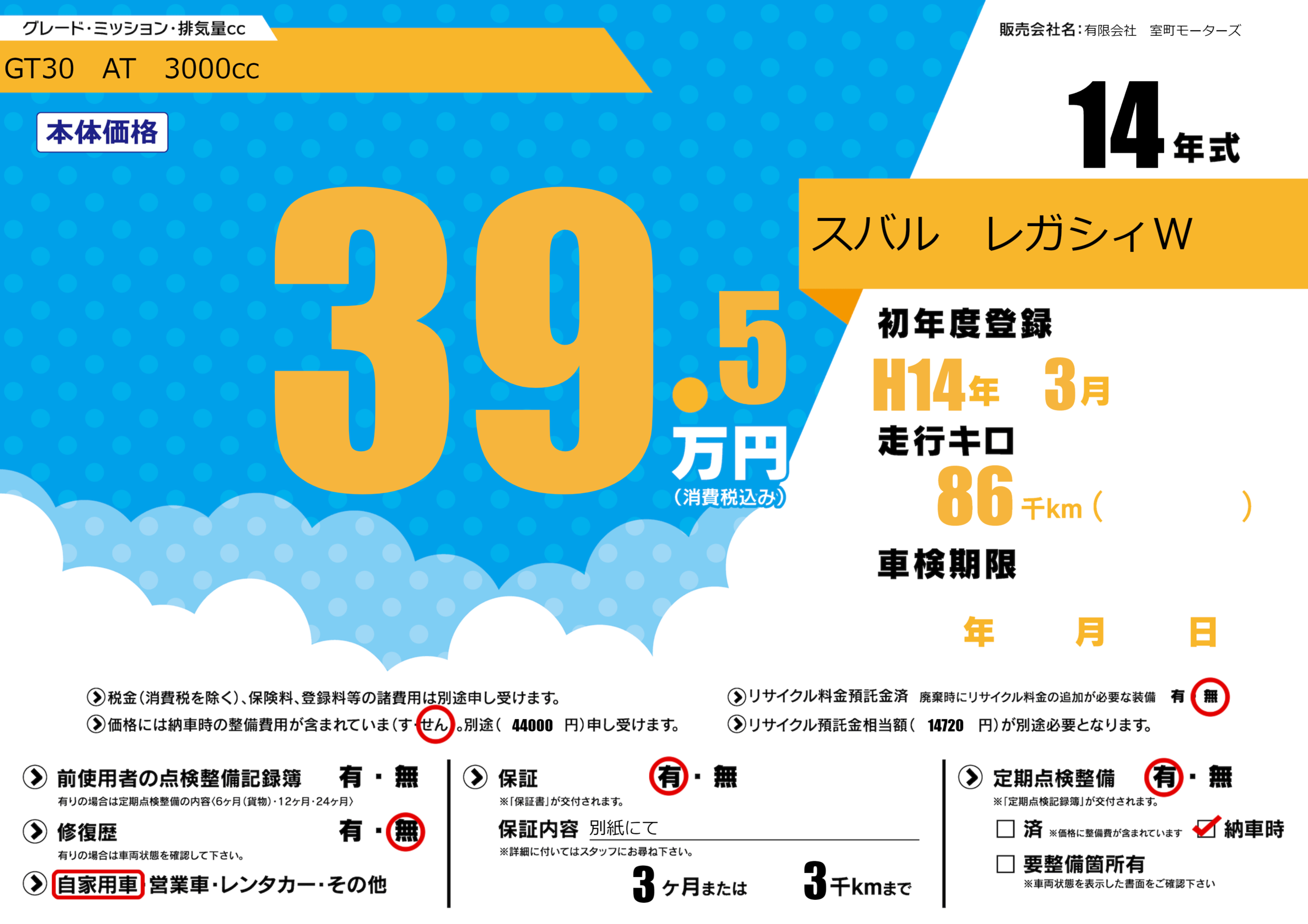 保証付き 保証内容(別紙にて) 3ヶ月または(3)千kmまで |