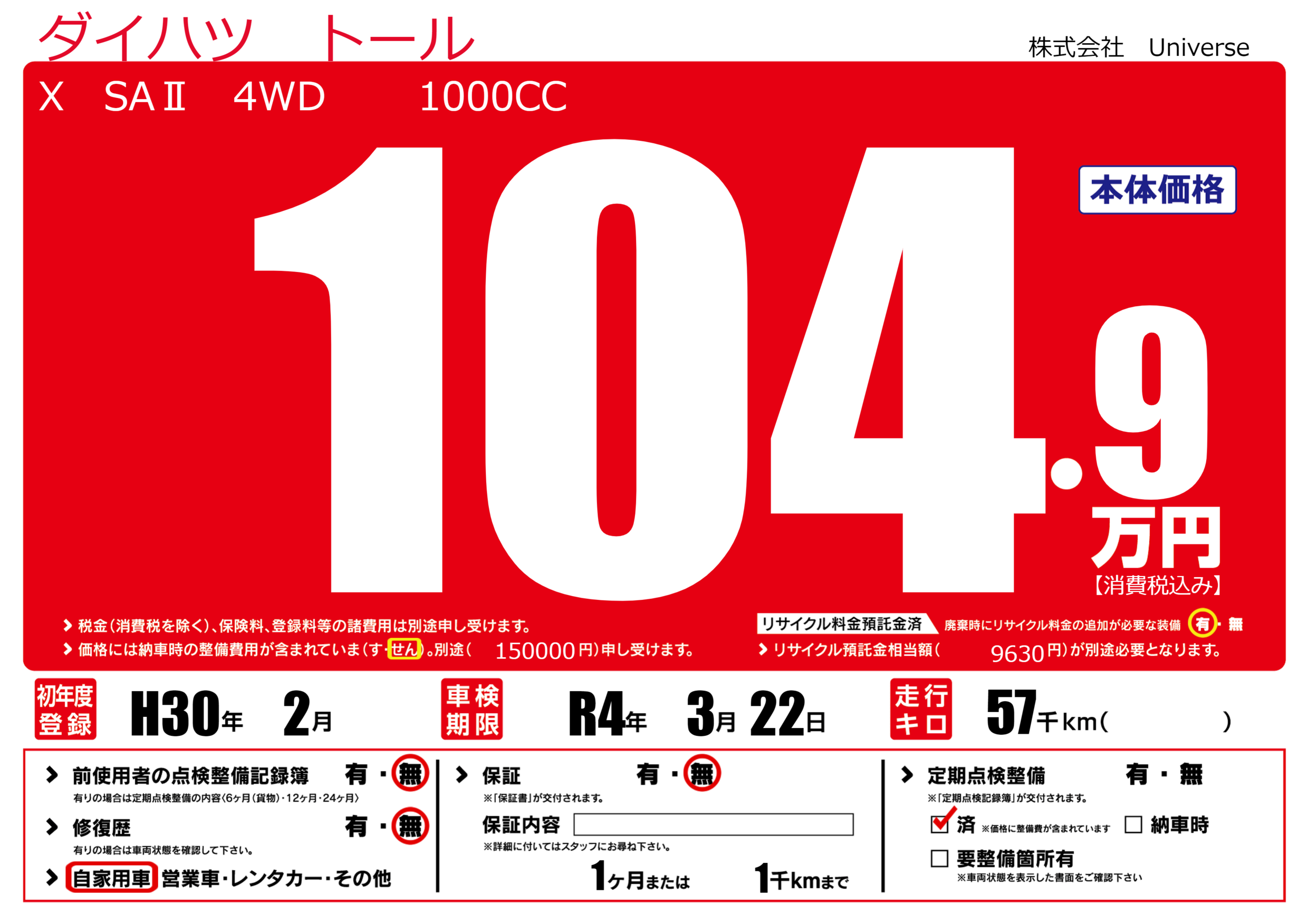 | 車名 | ダイハツ トール | グレード ミッション 排気量 |
