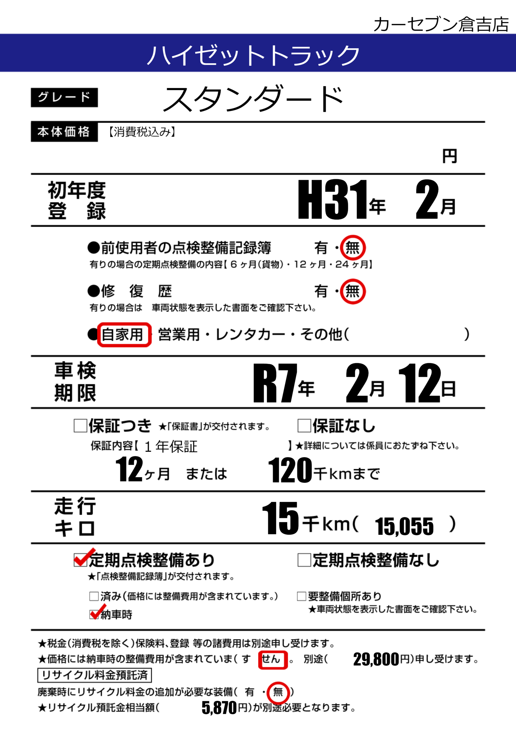 | 定期点検整備 | 定期点検整備あり 納車時あり | ||