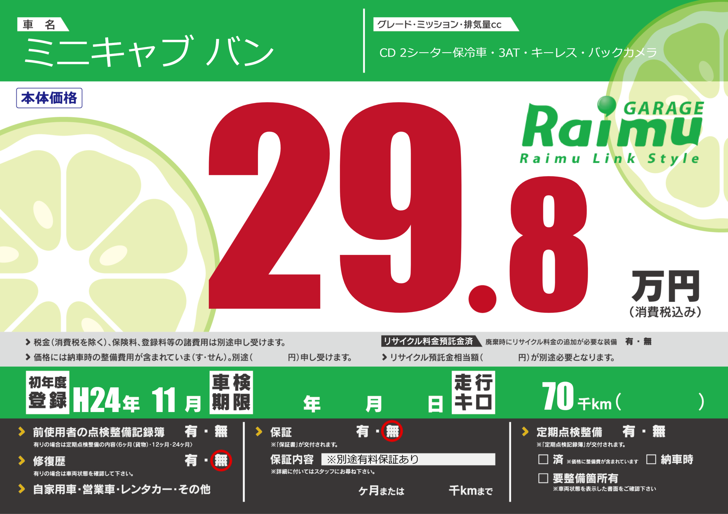 | 車名 | ミニキャブ バン | グレード ミッション 排気量 |