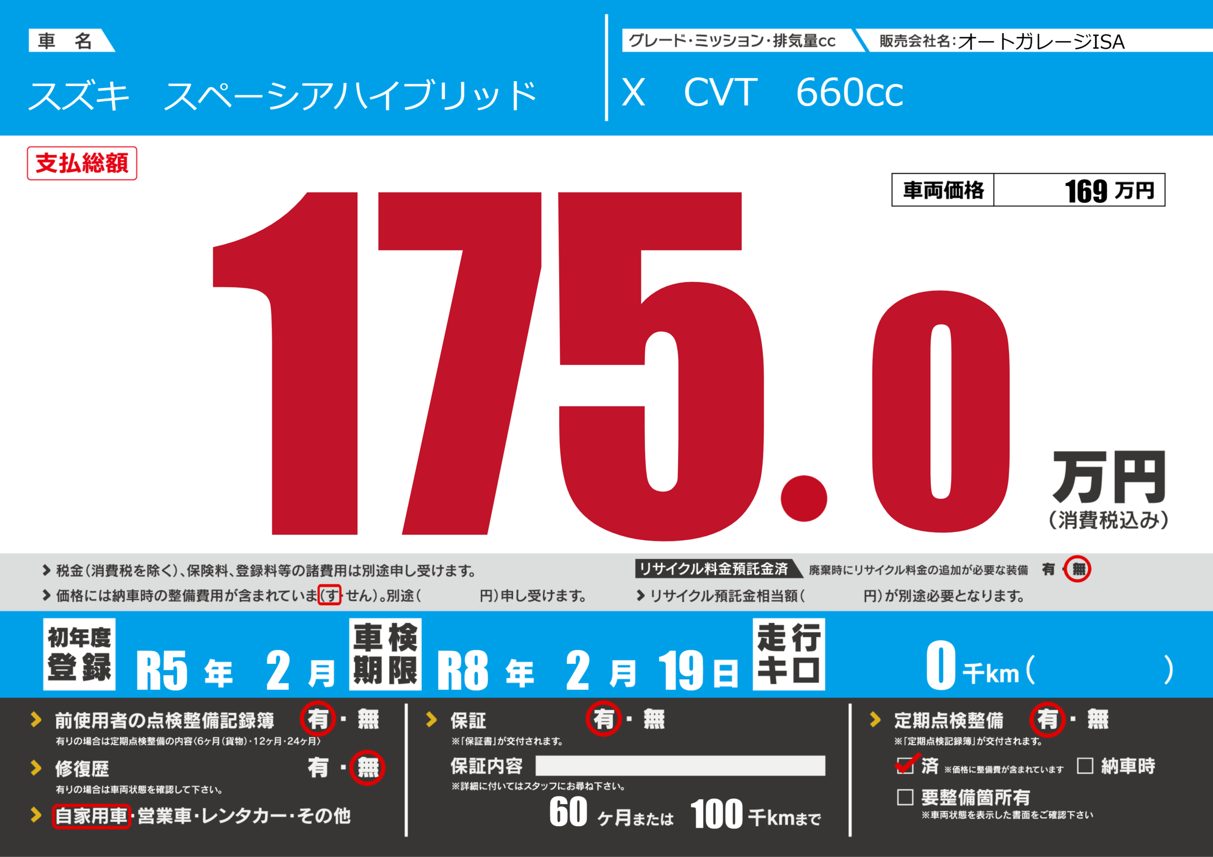 | 定期点検整備 | 定期点検整備あり 定期点検整備済み | ||