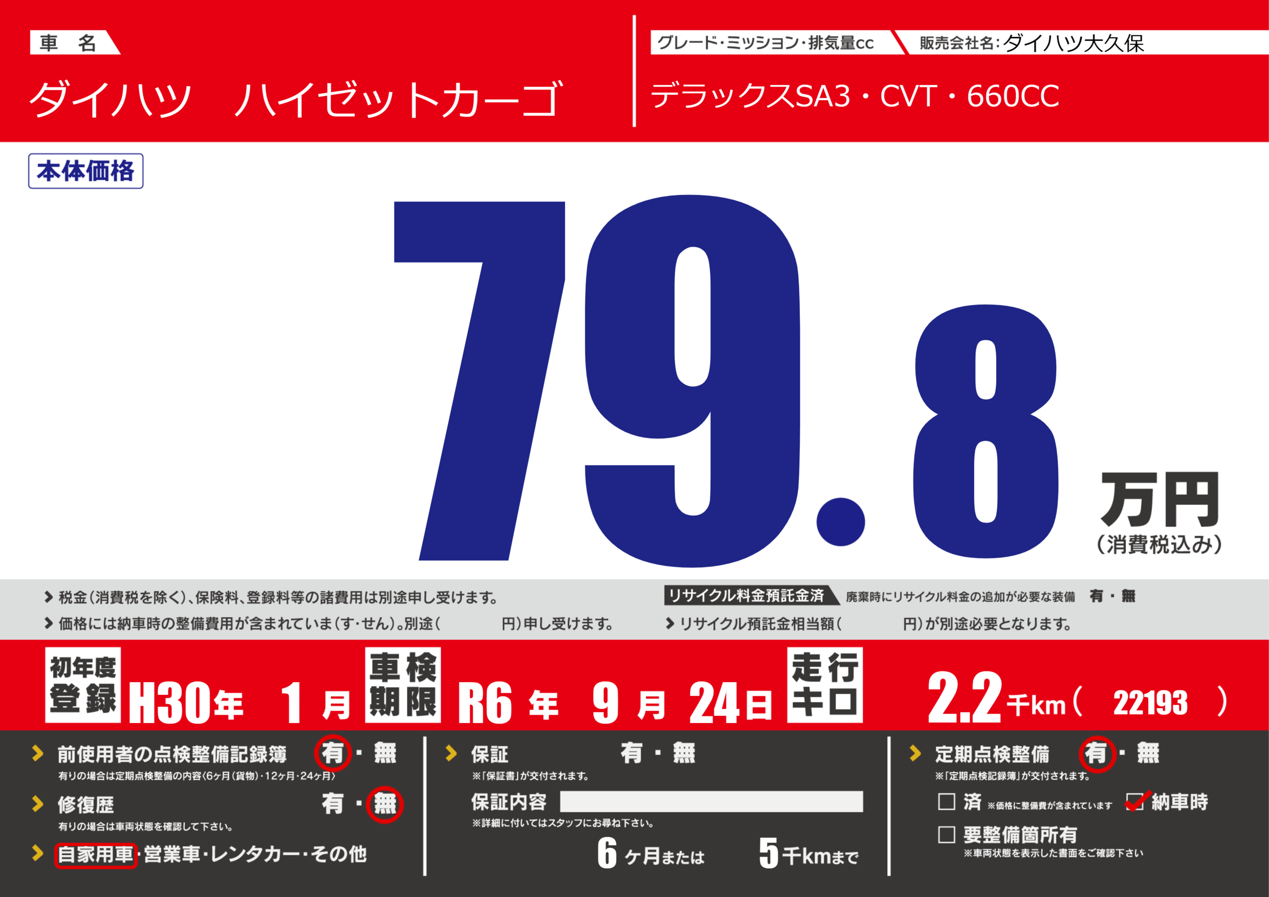 | 車名 | ダイハツ ハイゼットカーゴ | グレード ミッション 排気量 |