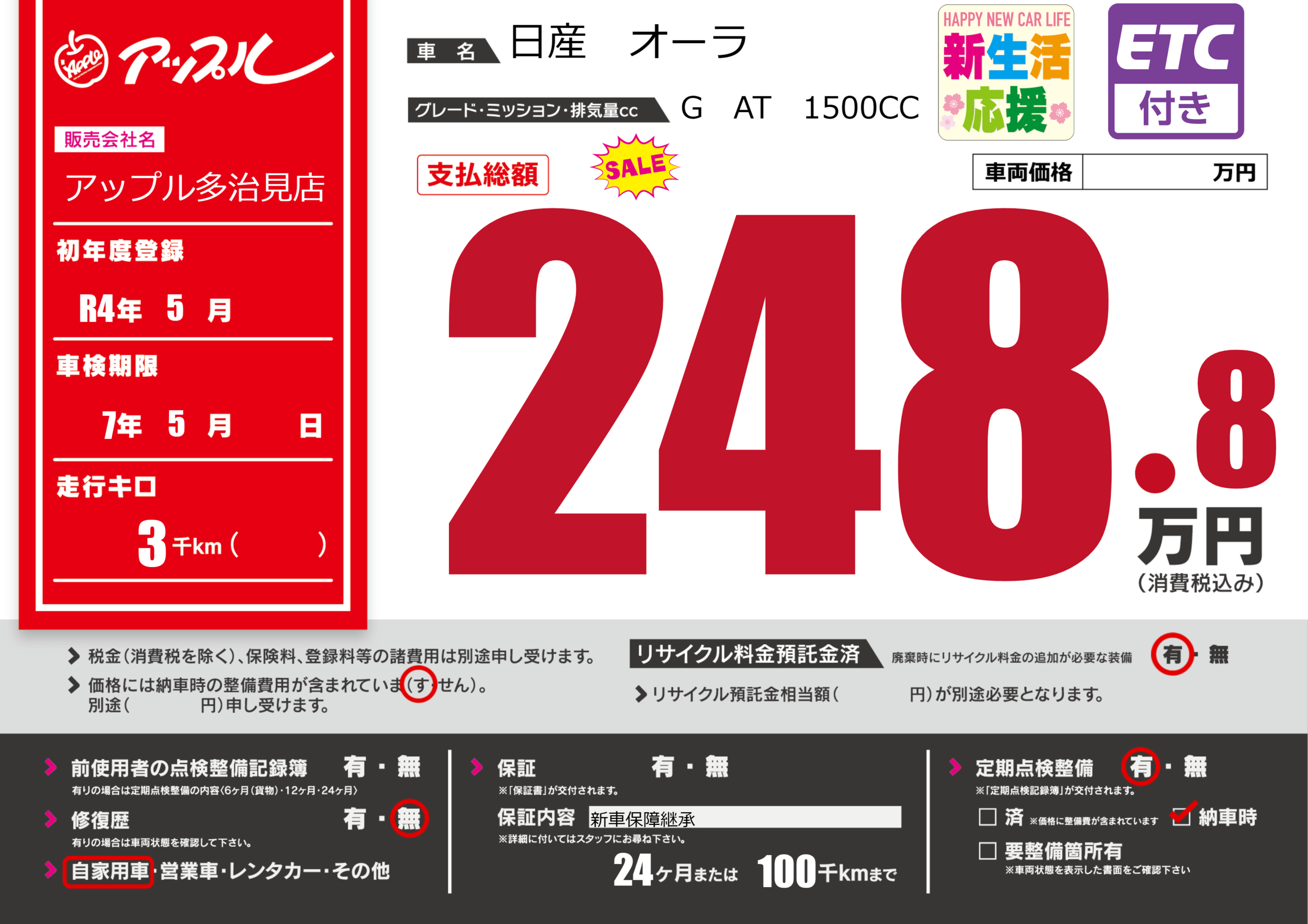 | 車名 | 日産 オーラ | グレード ミッション 排気量 |
