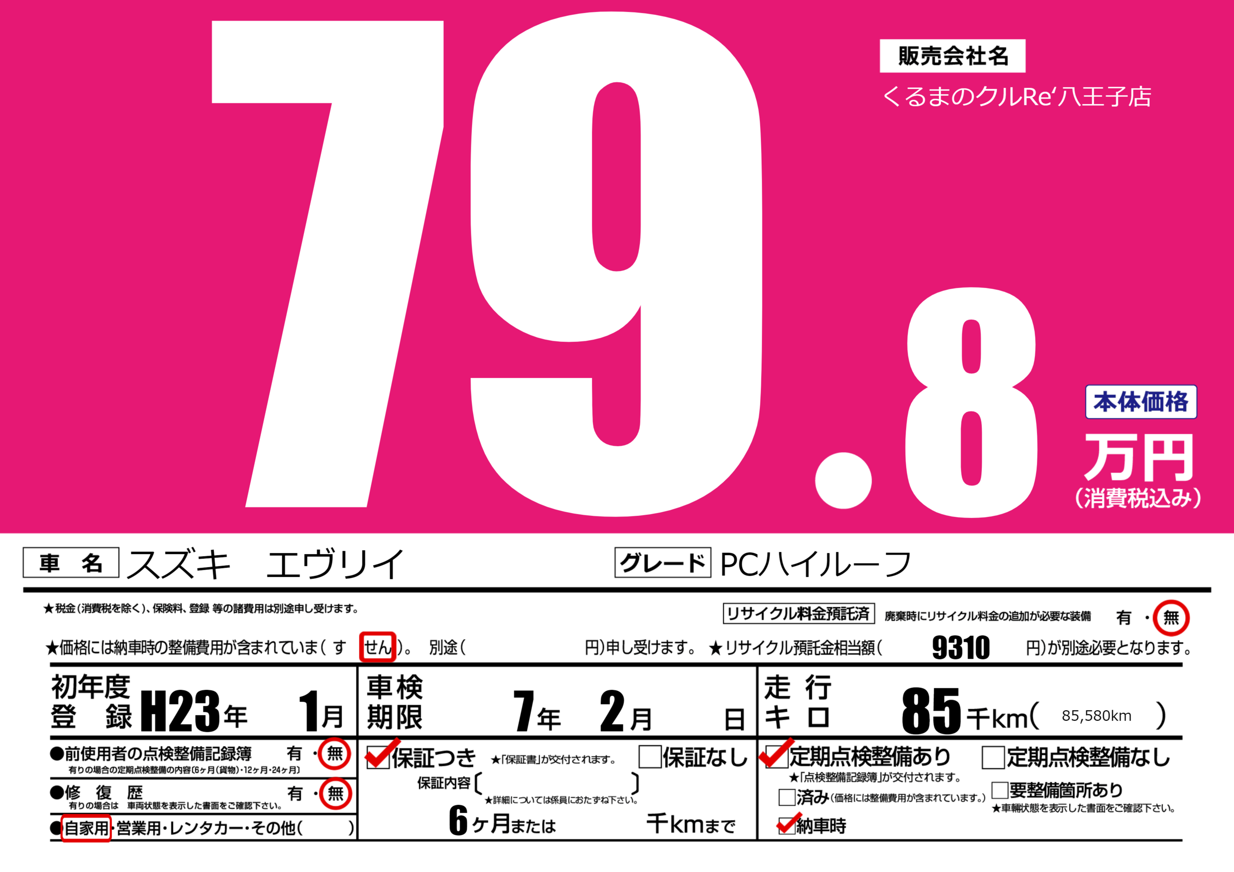 | 定期点検整備 | 定期点検整備あり 納車時あり | ||
