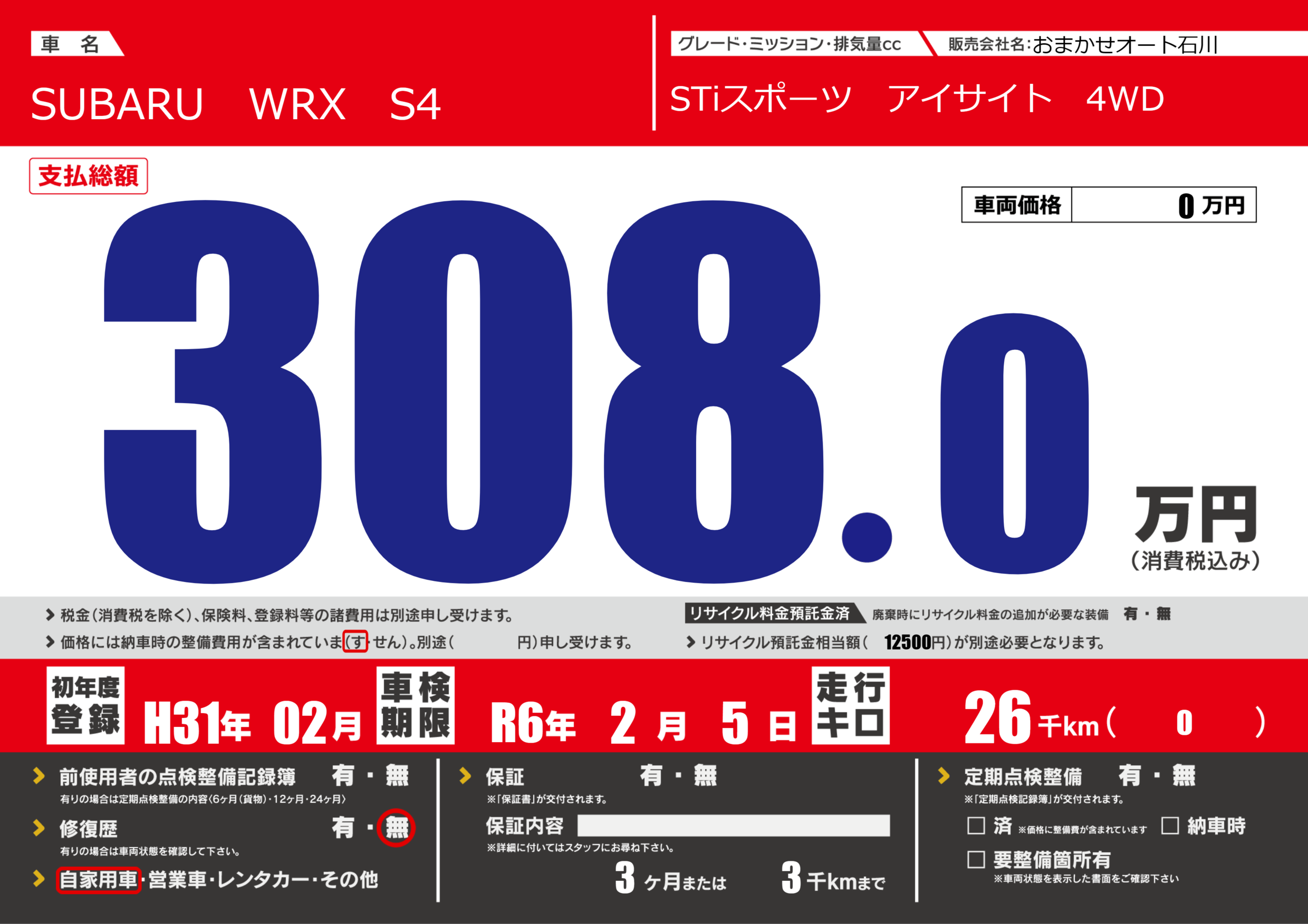 | 車名 | SUBARU WRX S4 | グレード ミッション 排気量 |