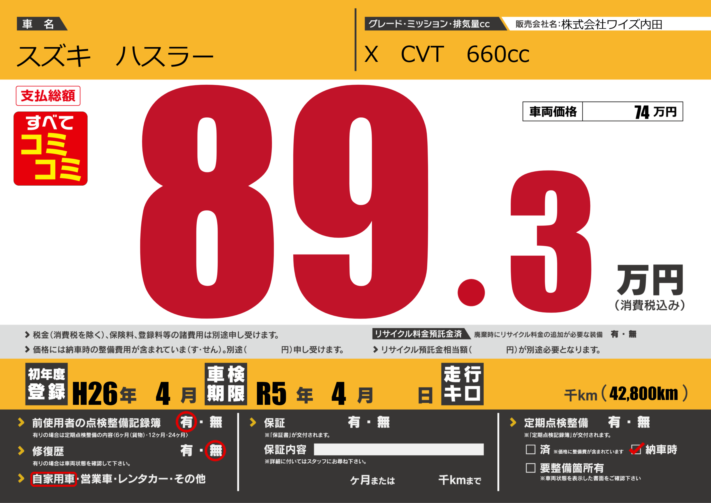 | 車名 | スズキ ハスラー | グレード ミッション 排気量 |