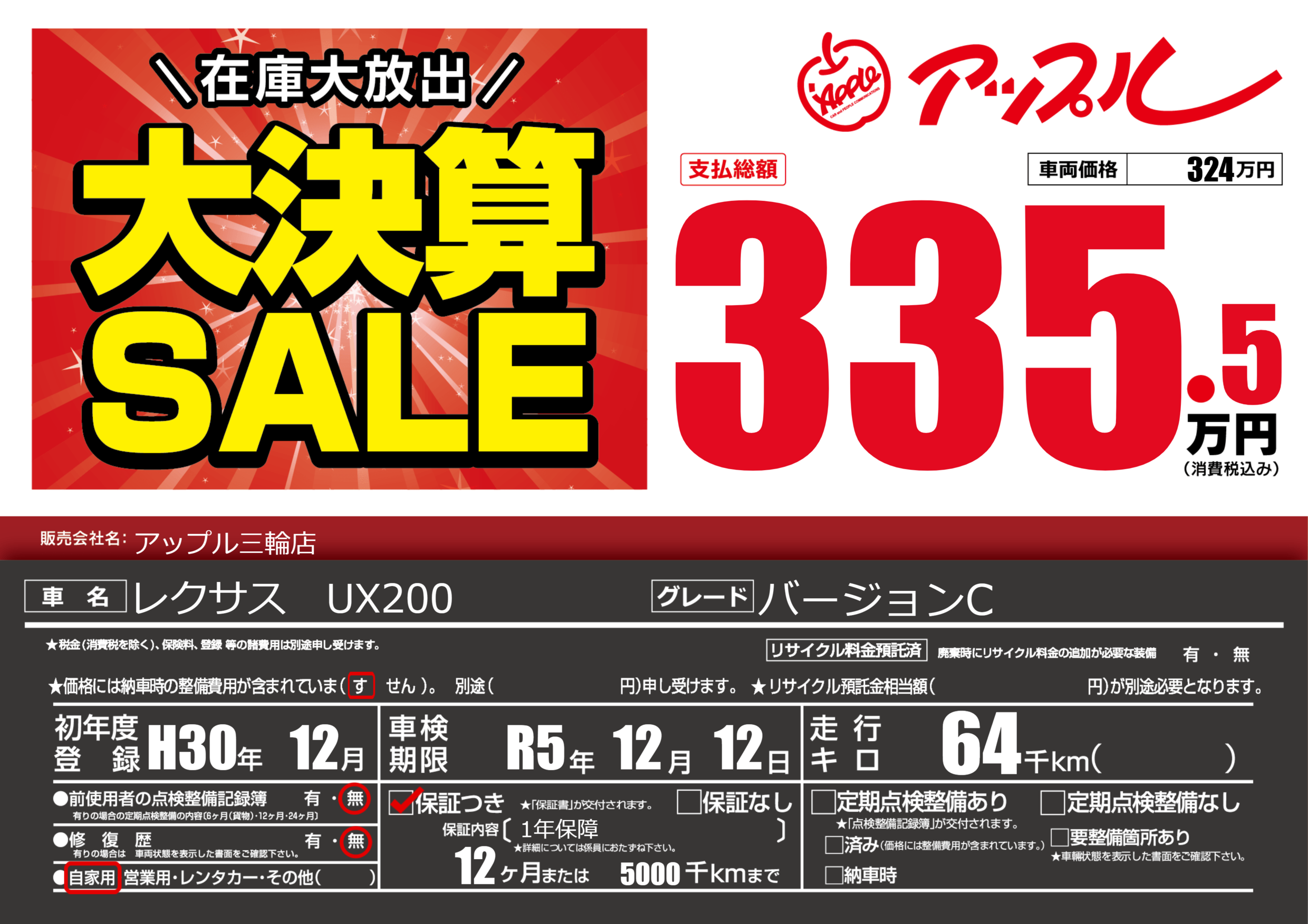 保証付き 保証内容(1年保障) 12ヶ月または5000千km |
