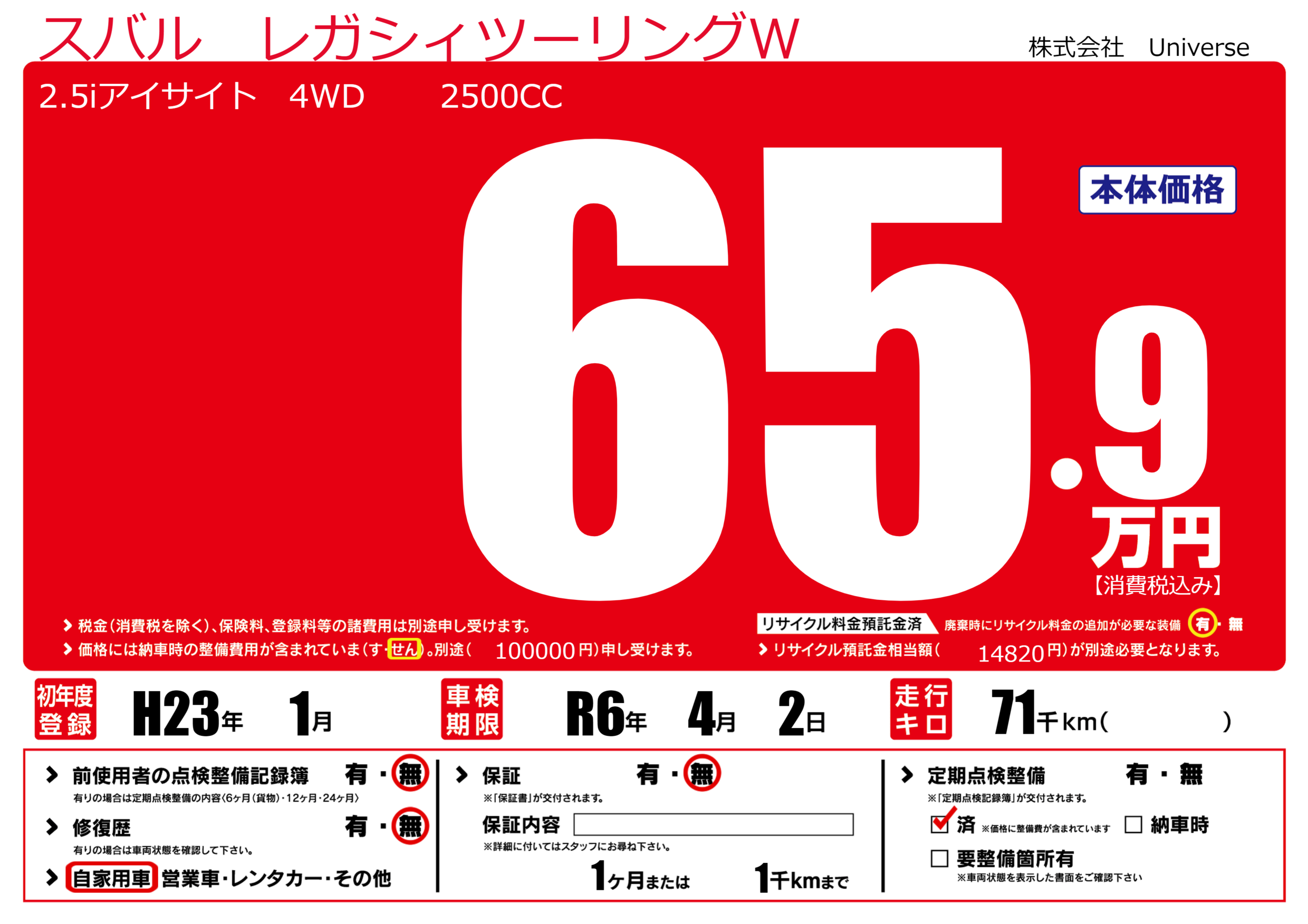 | 車名 | スバル レガシィツーリングW | グレード ミッション 排気量 |