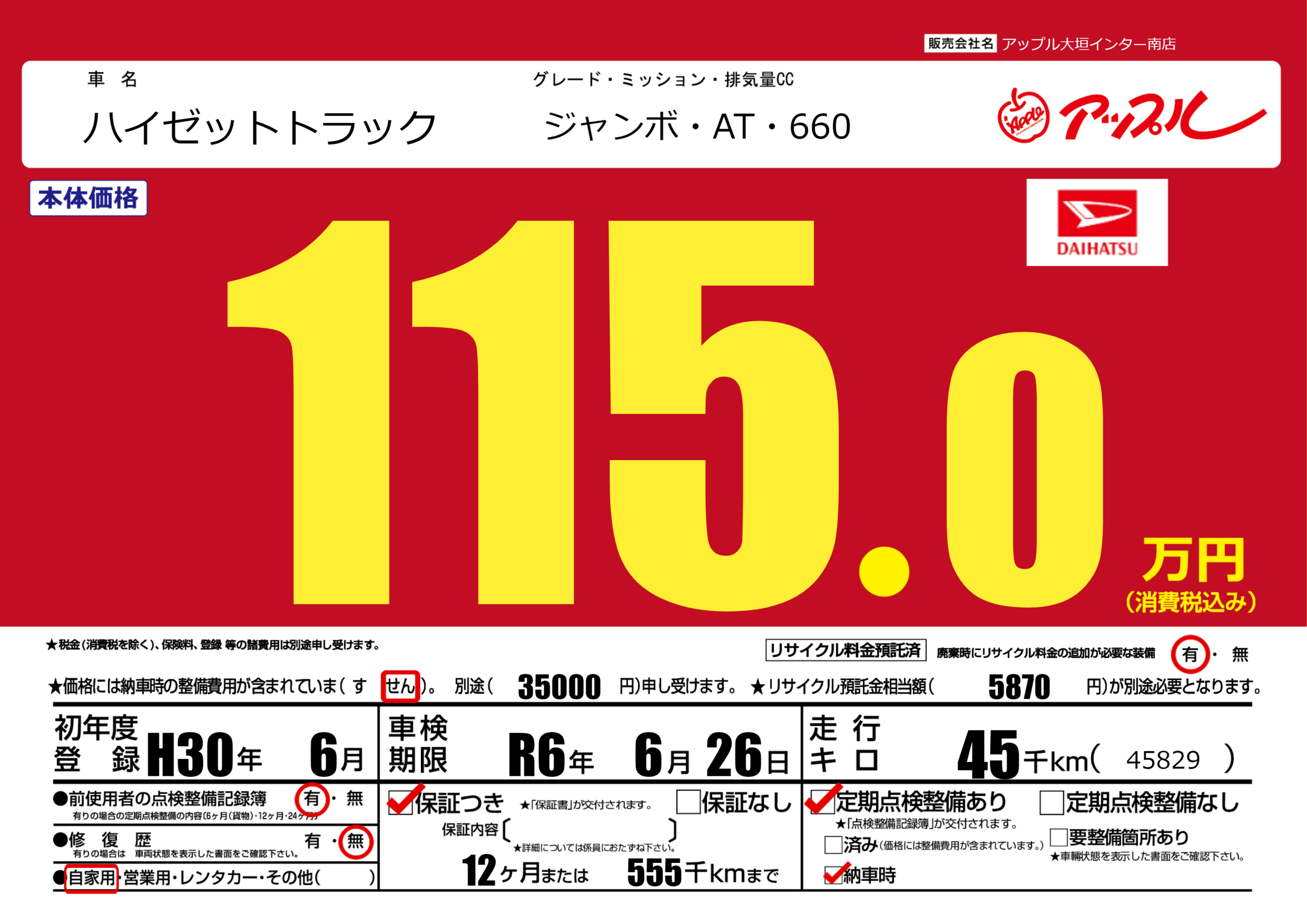 | 車名 | ハイゼットトラック | グレード ミッション 排気量 |