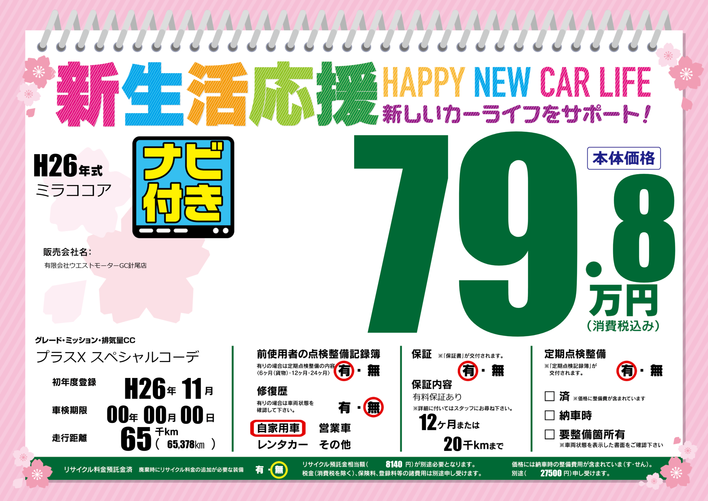 | 車名 | ミラココア | グレード ミッション 排気量 |