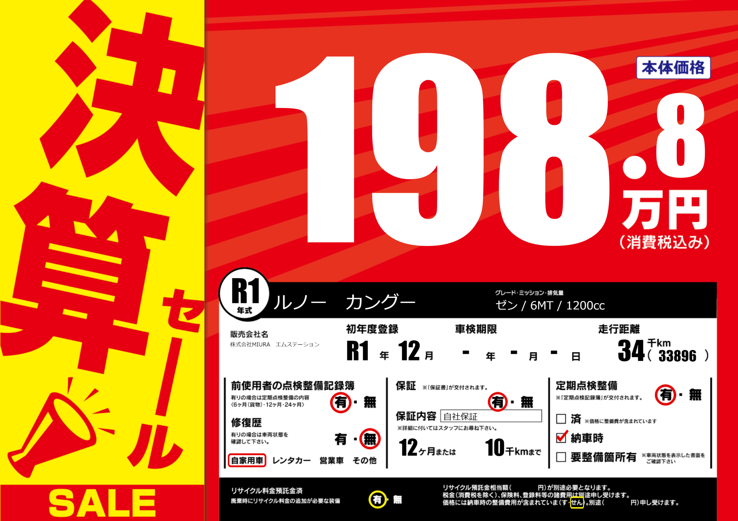 保証付き 保証内容(自社保証) 12ヶ月または(10)千kmまで |