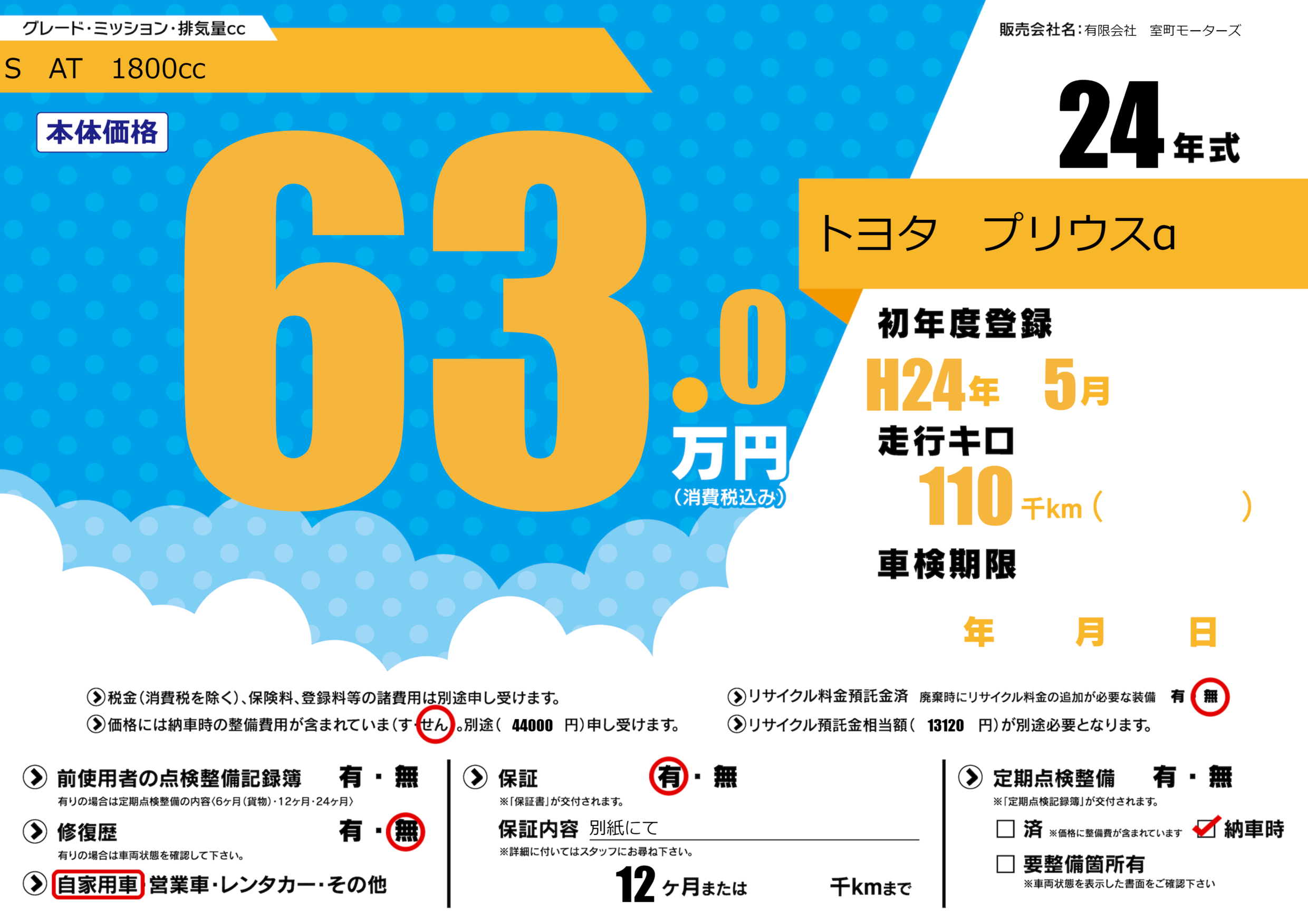 保証付き 保証内容(別紙にて) 12ヶ月または()千kmまで |