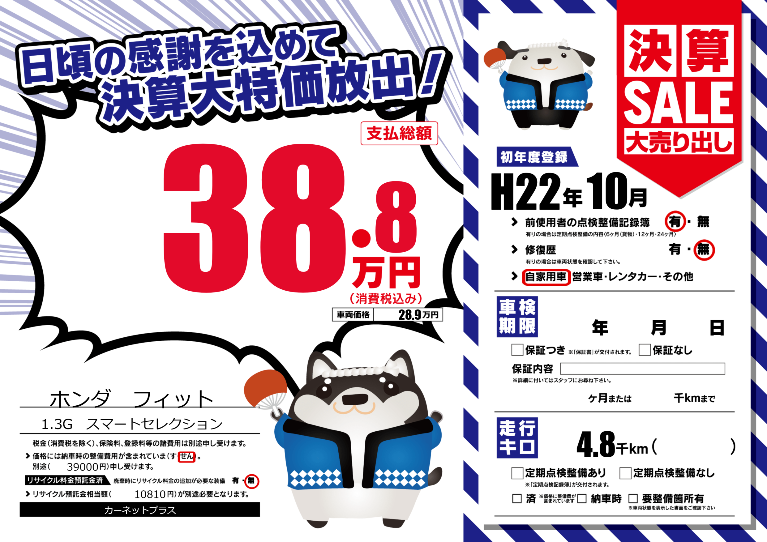| 走行キロ | 0.4万km | 初年度登録 | H22年10月 |