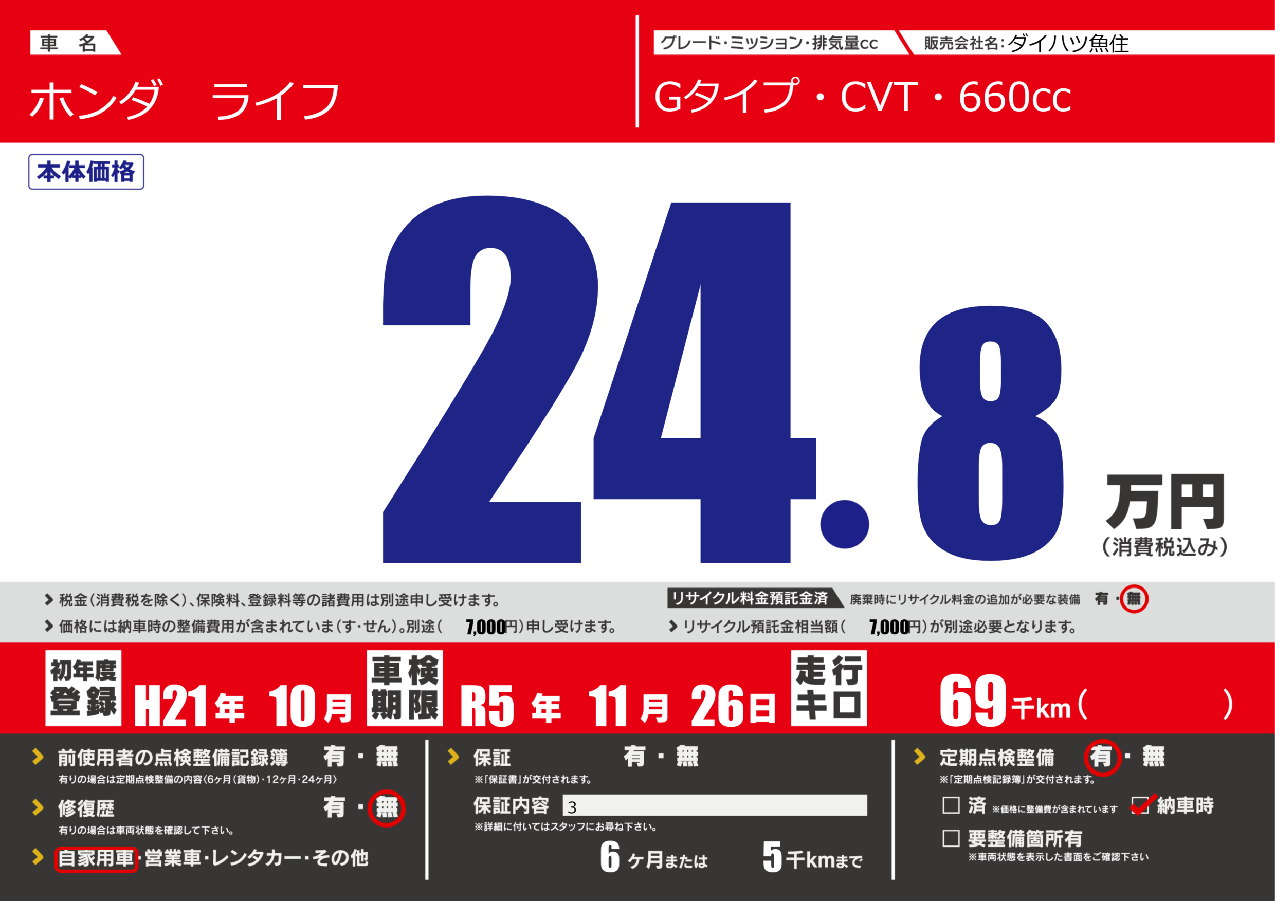 | 走行キロ | 6.9万km | 初年度登録 | H21年10月 |