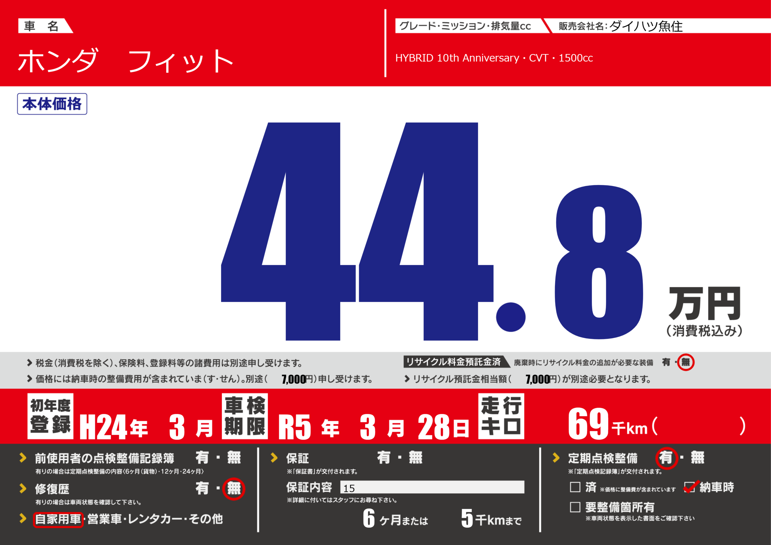 | 車名 | ホンダ フィット | グレード ミッション 排気量 |