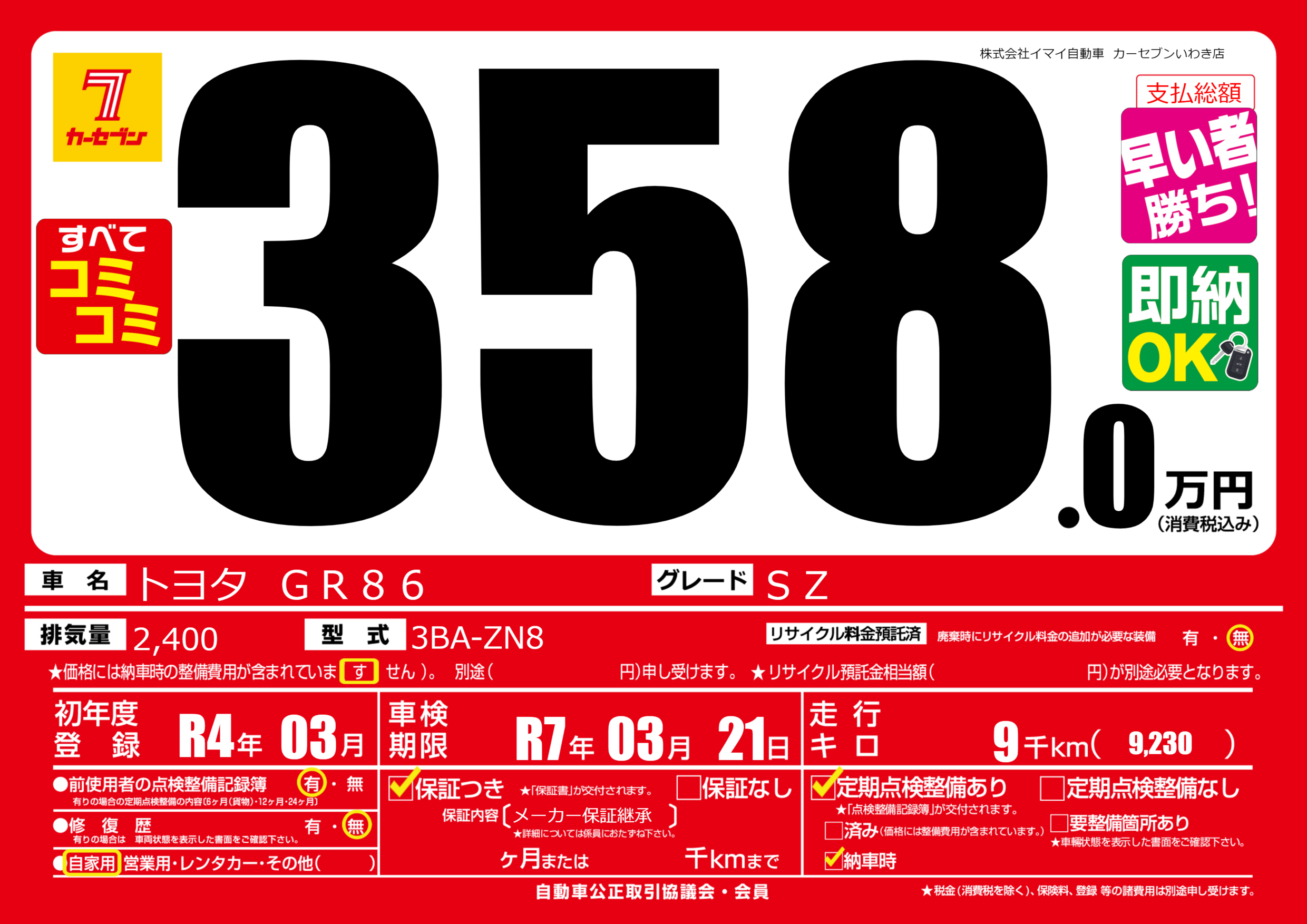 | 車名 | トヨタ GR86 | グレード ミッション 排気量 |