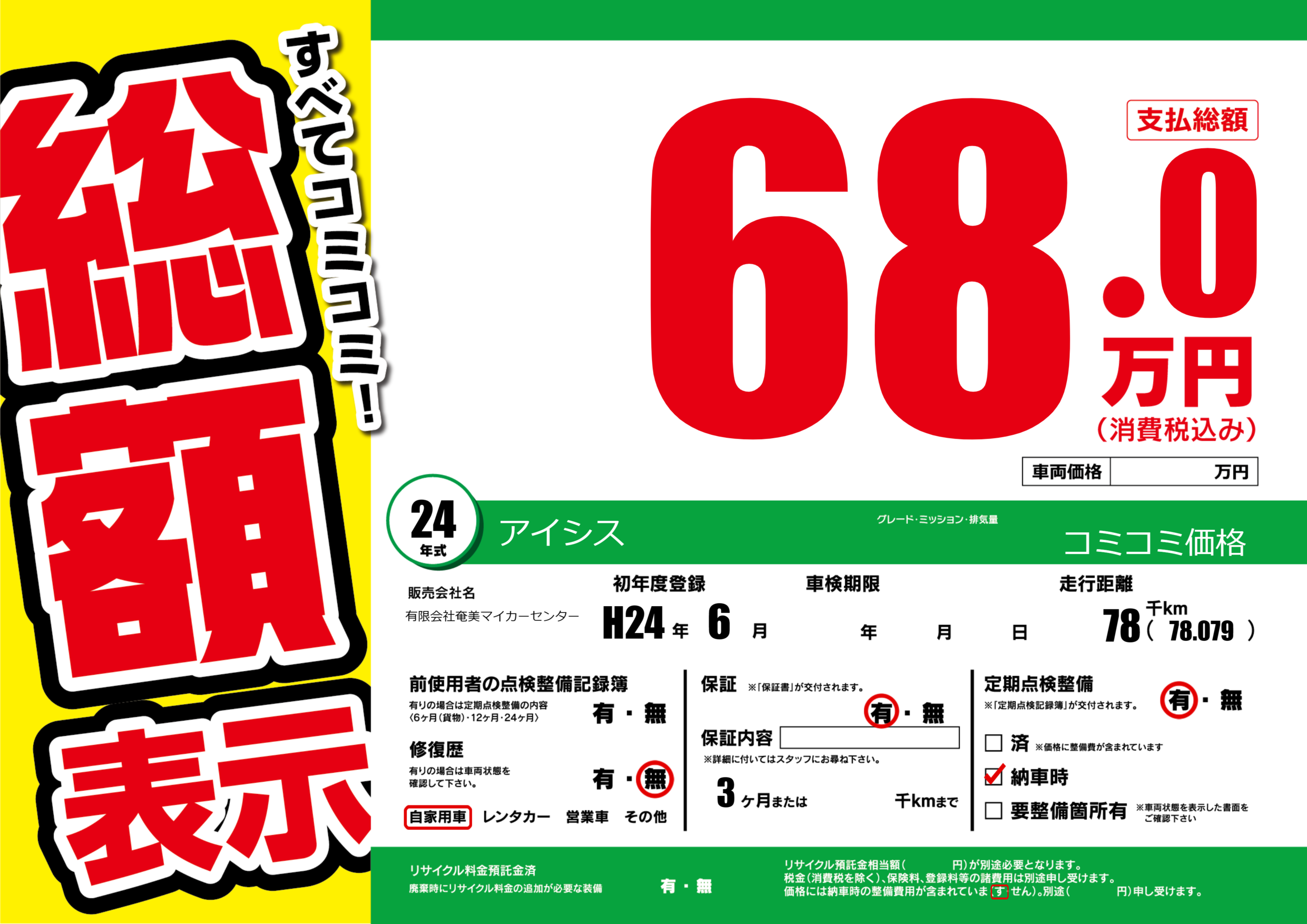 | 走行キロ | 7.8万km | 初年度登録 | H24年6月 |