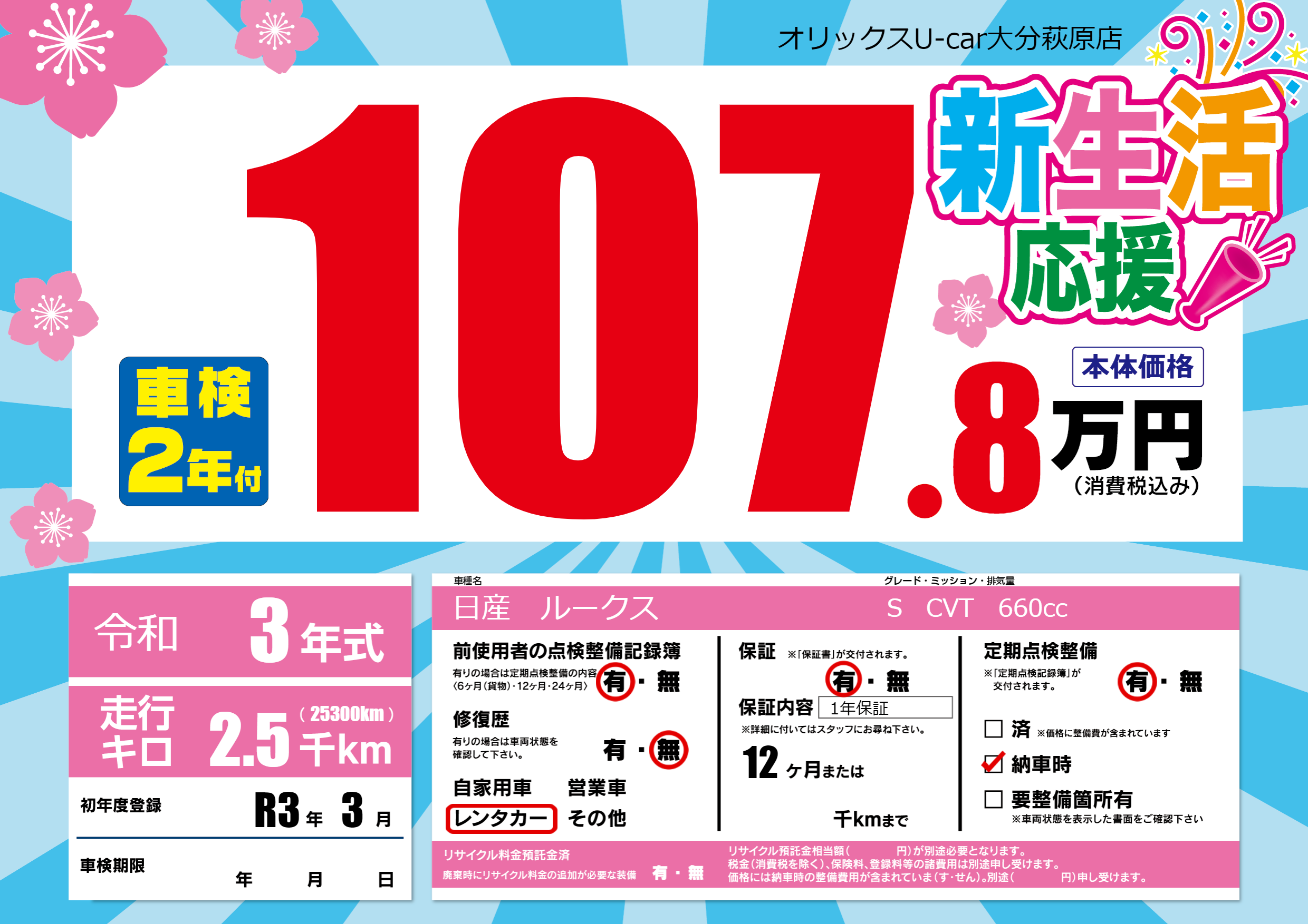 | 走行キロ | 0.2万km | 初年度登録 | R3年3月 |