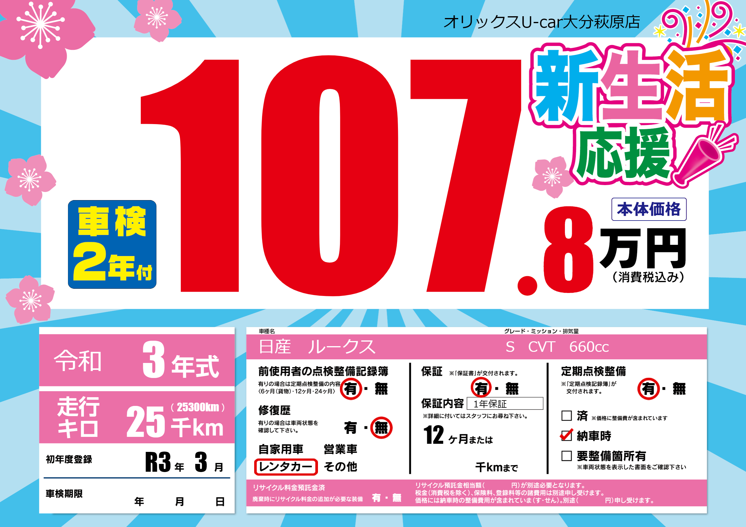 | 車名 | 日産 ルークス | グレード ミッション 排気量 |