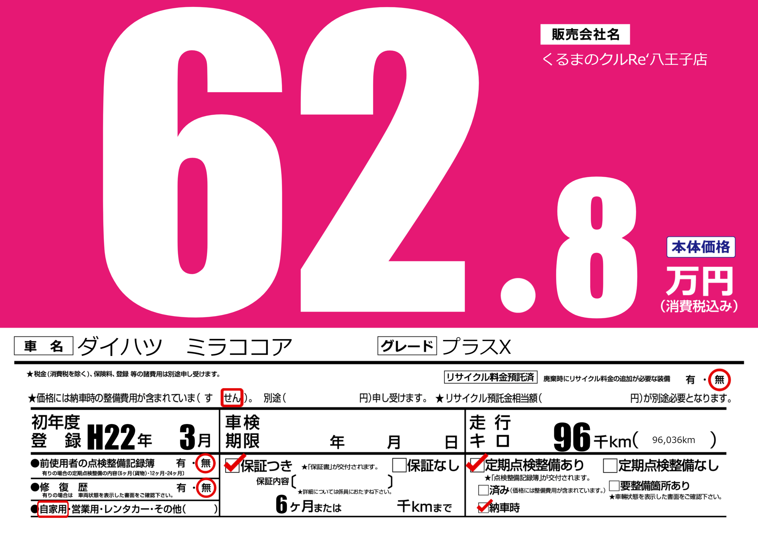 | 走行キロ | 9.6万km | 初年度登録 | H22年3月 |