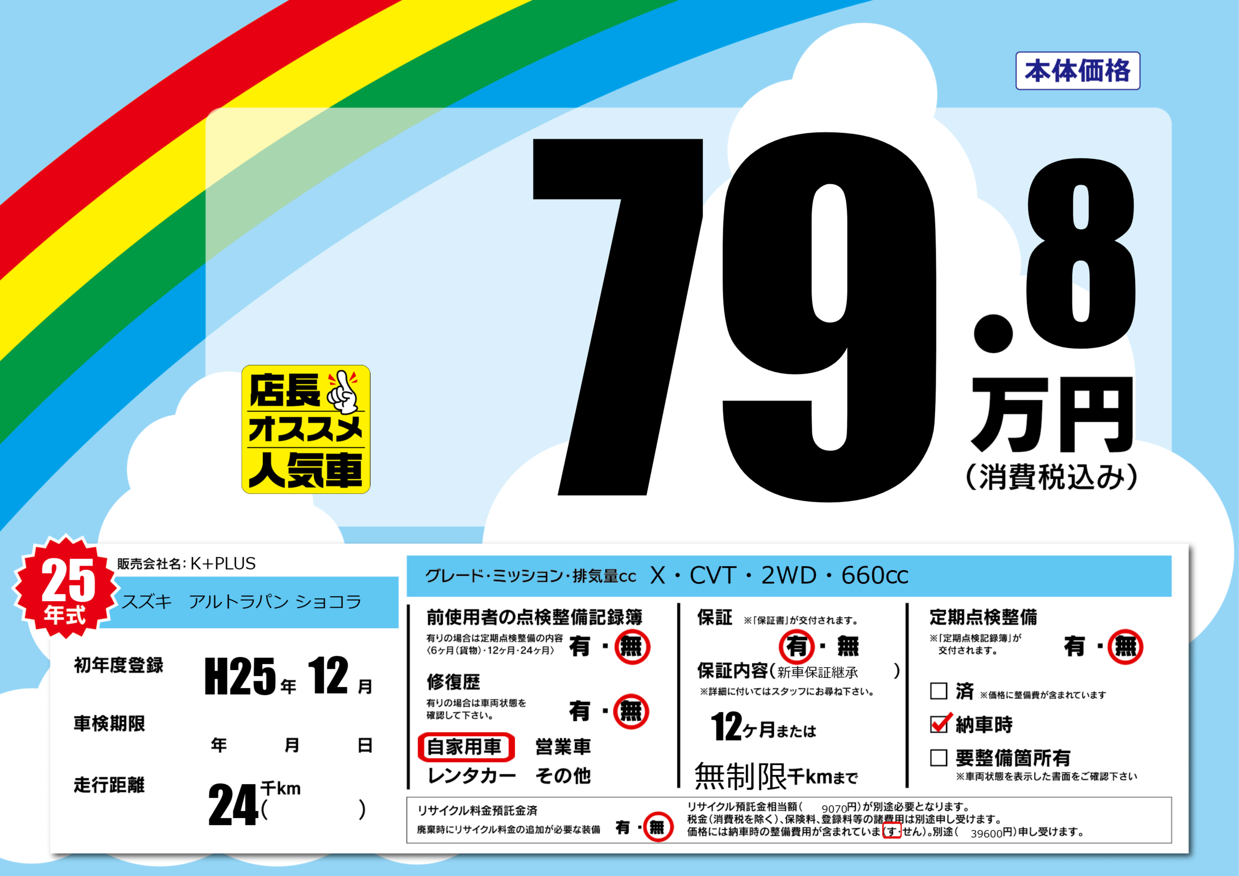 | 走行キロ | 2.4万km | 初年度登録 | H25年12月 |
